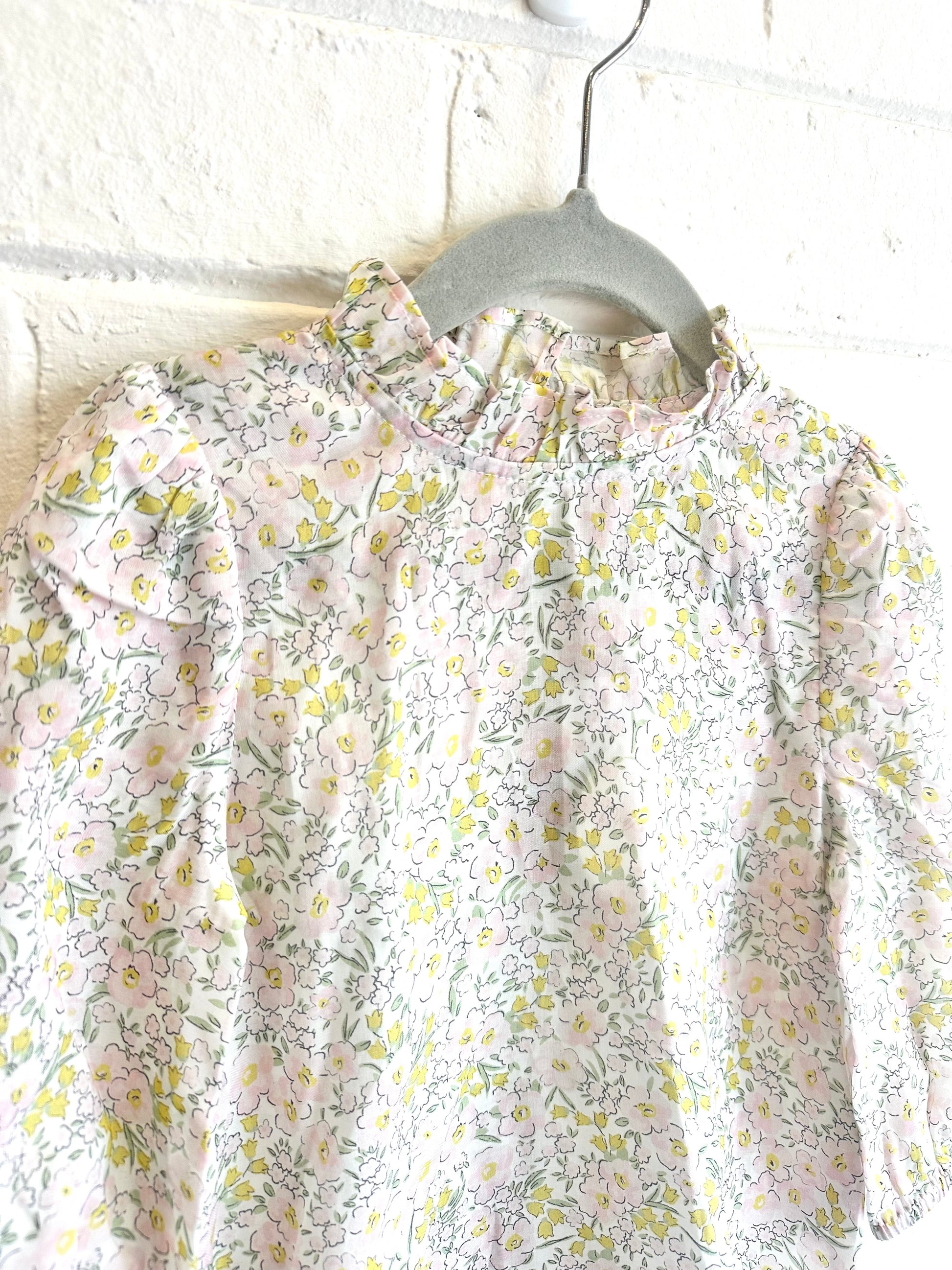 Description : floral blouse, ruffle neckline, long sleeves, back button and key hole
