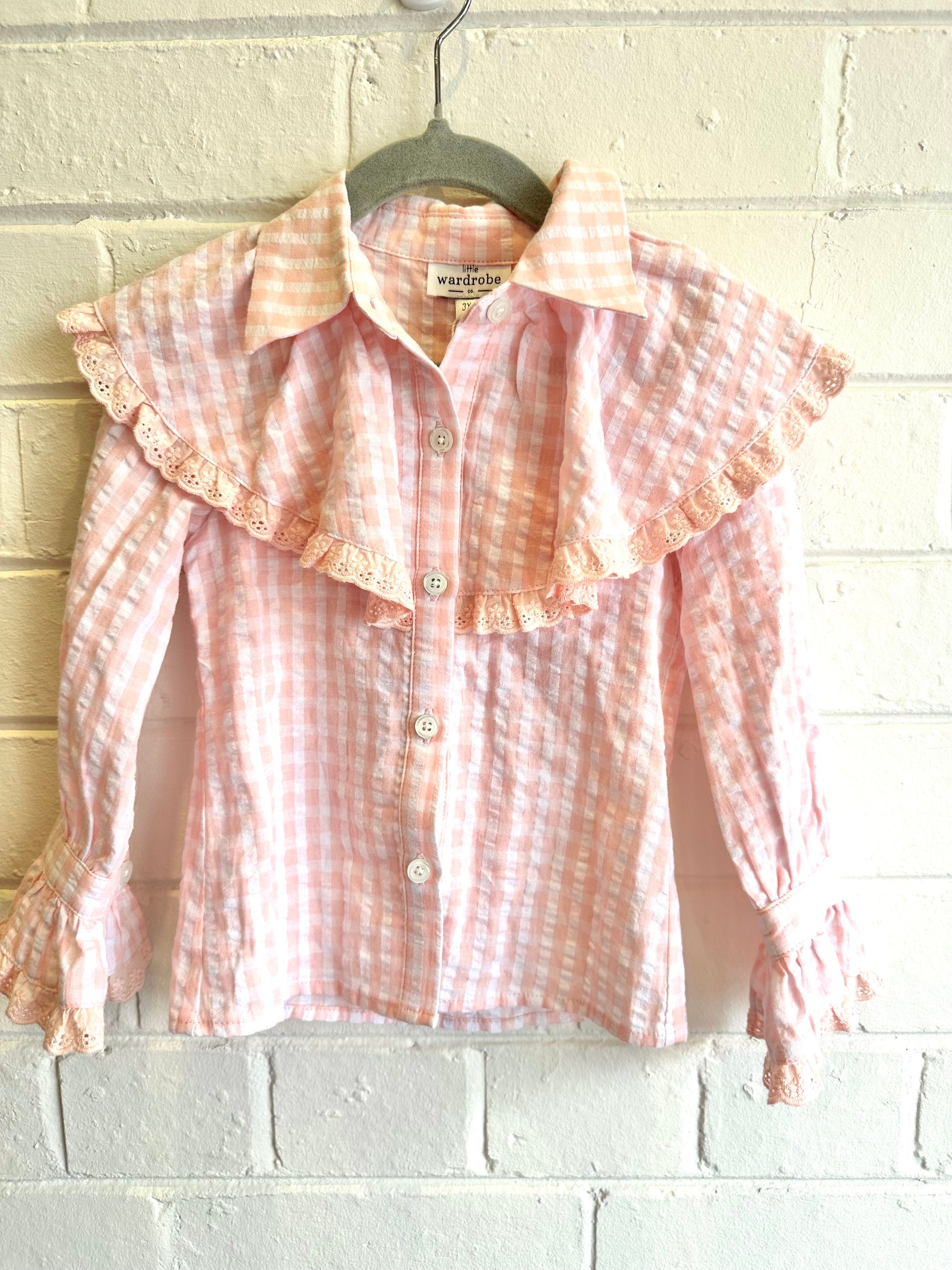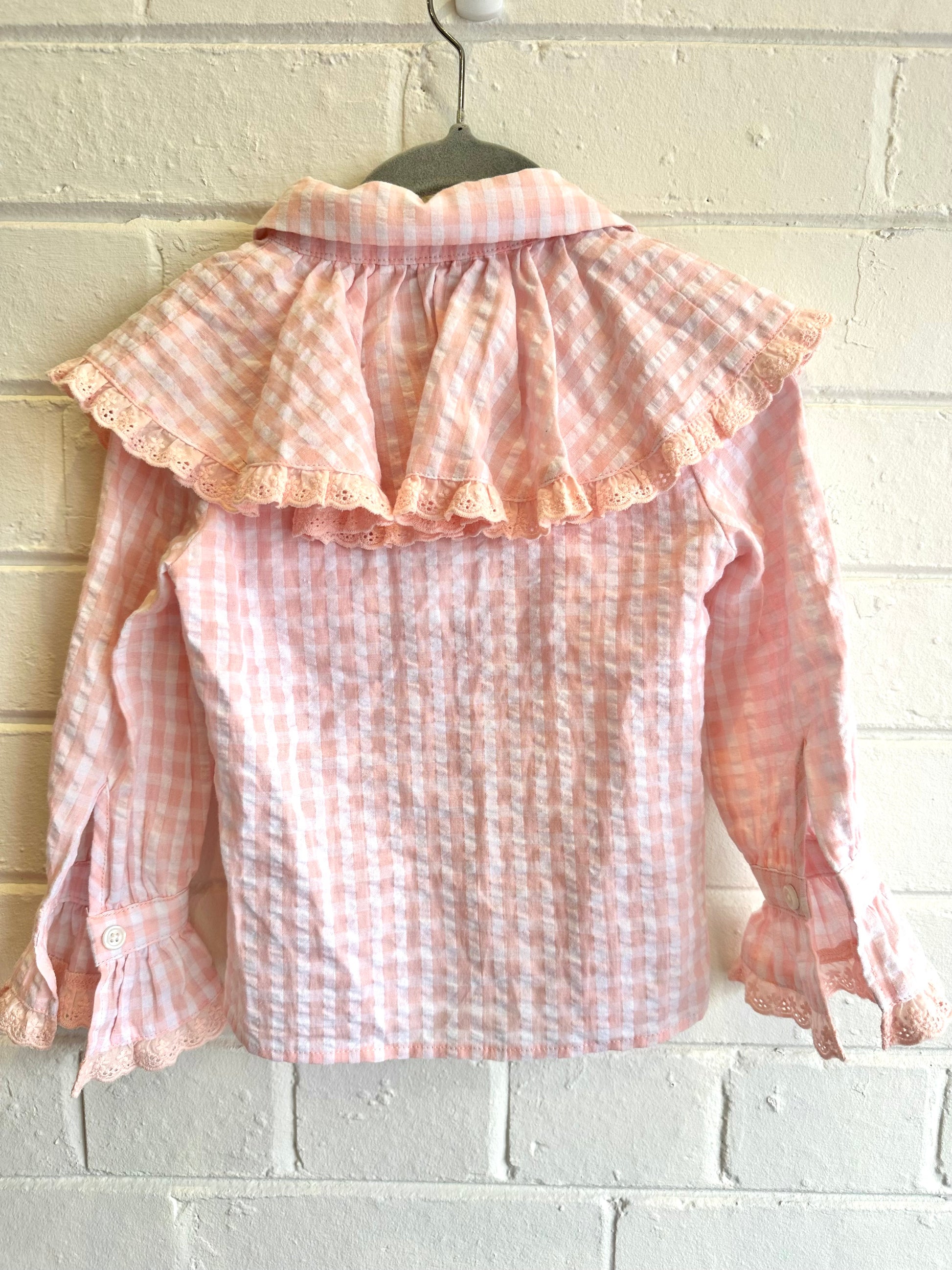 Description : pink gingham blouse, frill bib, long sleeves, front button down