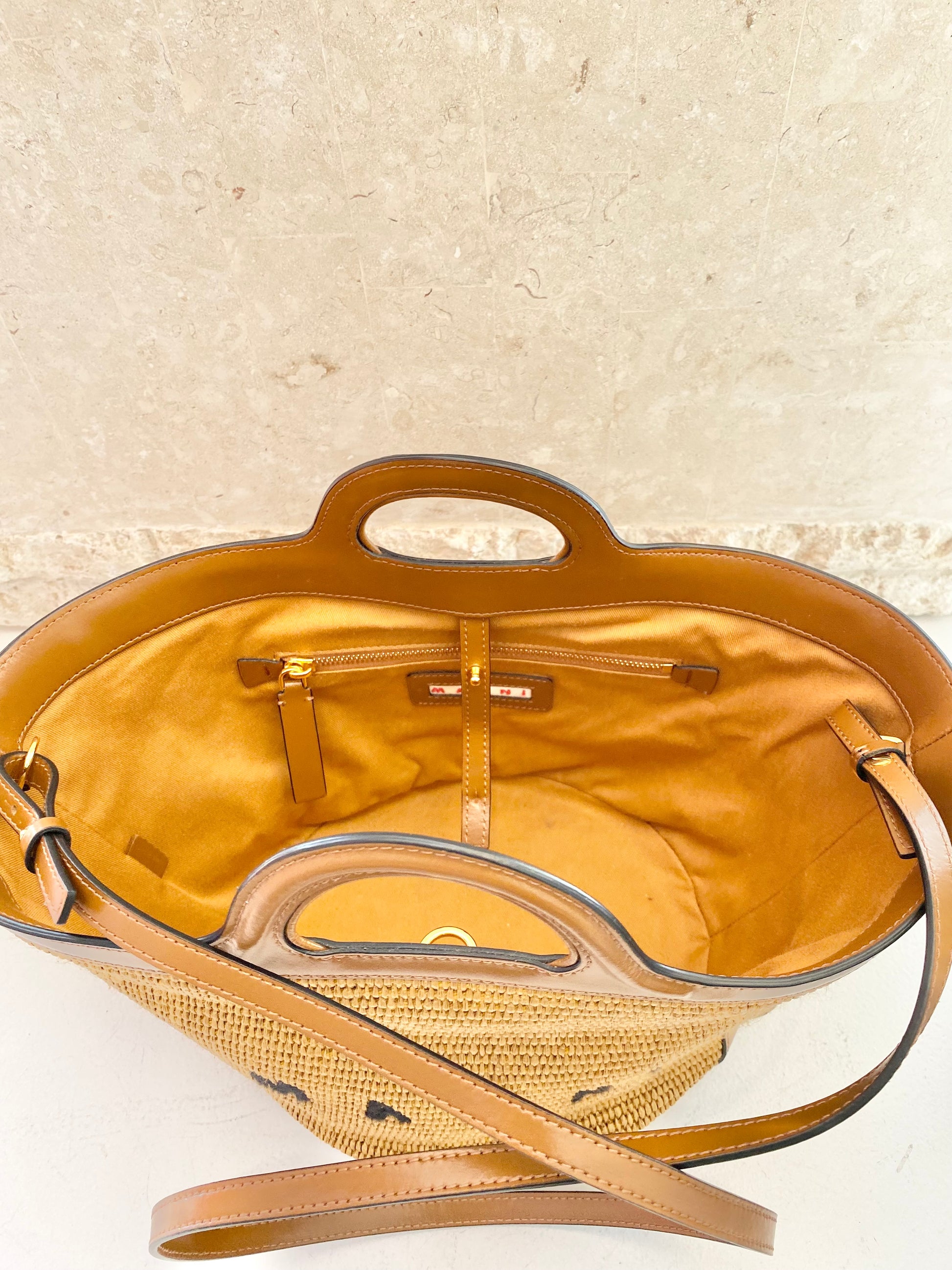 Description : - Two non-adjustable top handles, detachable non-adjustable shoulder strap - Interior zipped pocket - Cotton-canvas lining - Tab fastening at open top