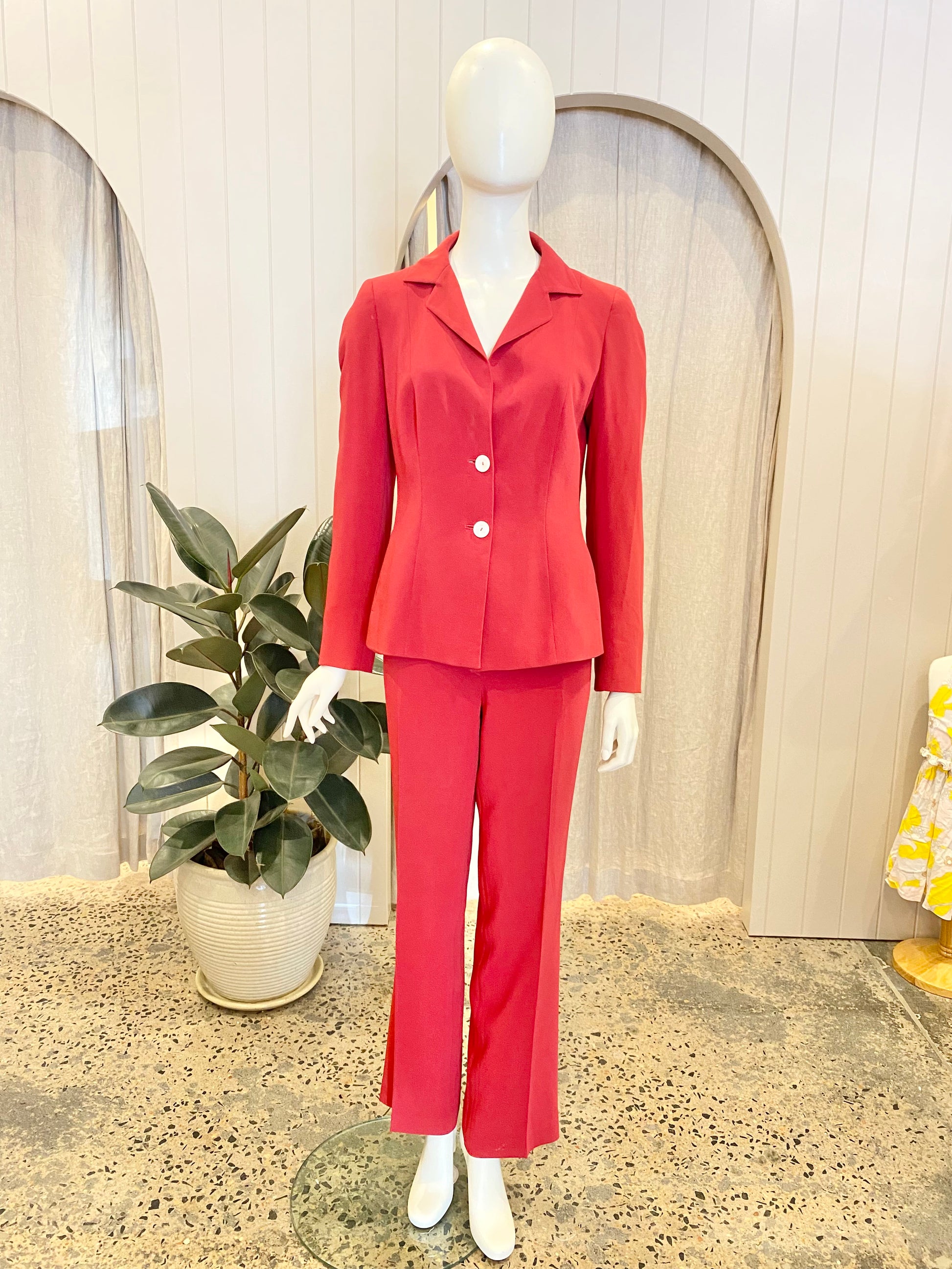 Description : Stunning vintage Max Mara suit in red! Blazer: - Single-breasted with twin contrast buttons, splits on the cuff in a fitted silhouette, lined, side seam pockets. Pants: Front & back pleat, zip and hook eye closure, straight leg