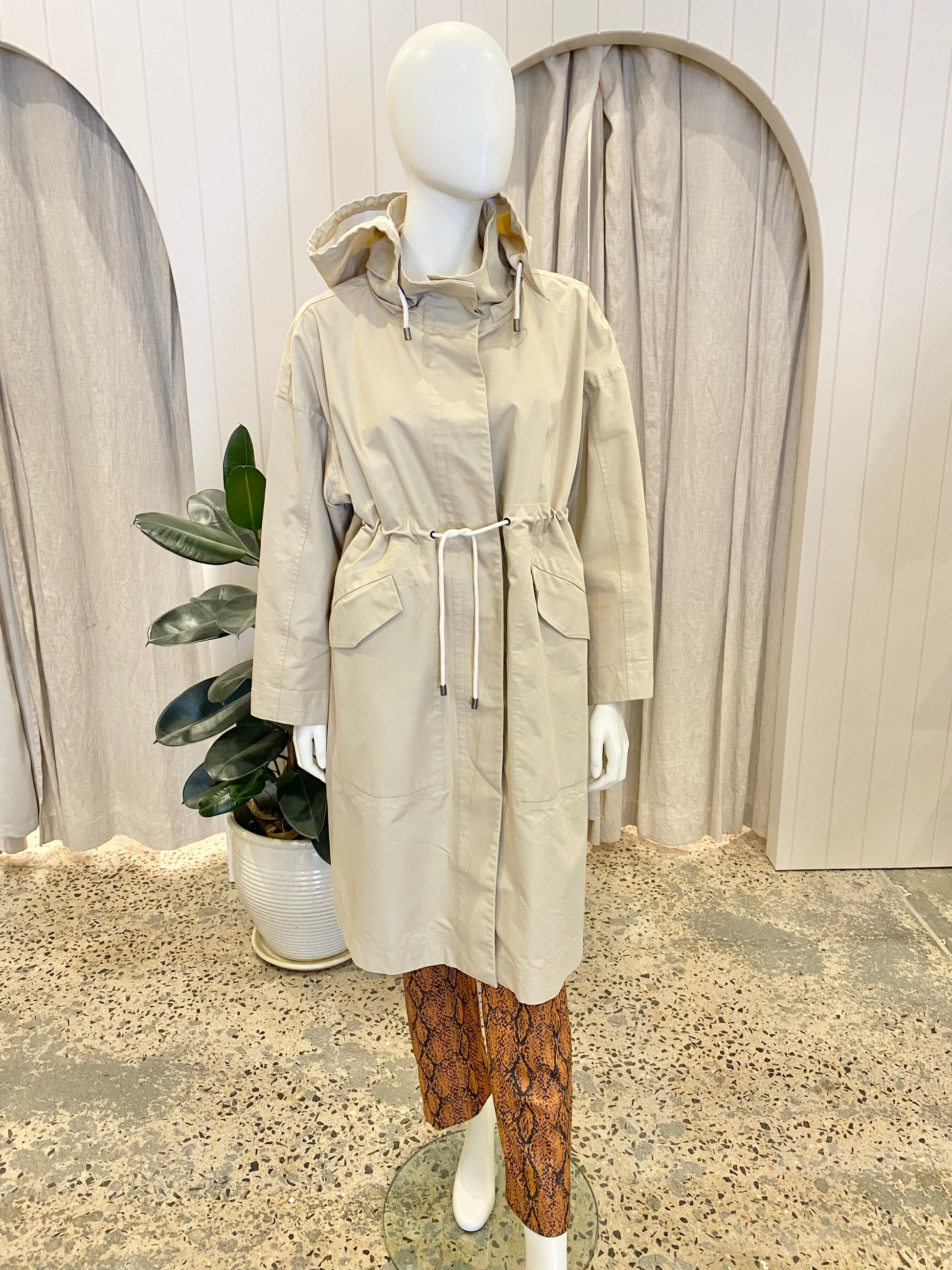 Description : The Max Mara trench coat is a timeless, single-breasted outerwear piece in a sand colour. Featuring adjustable drawstring on waist and hood, flap pockets, hidden buttons and removeable hood, it offers a sophisticated, versatile style suitable for both professional and casual, rainy-day wear.