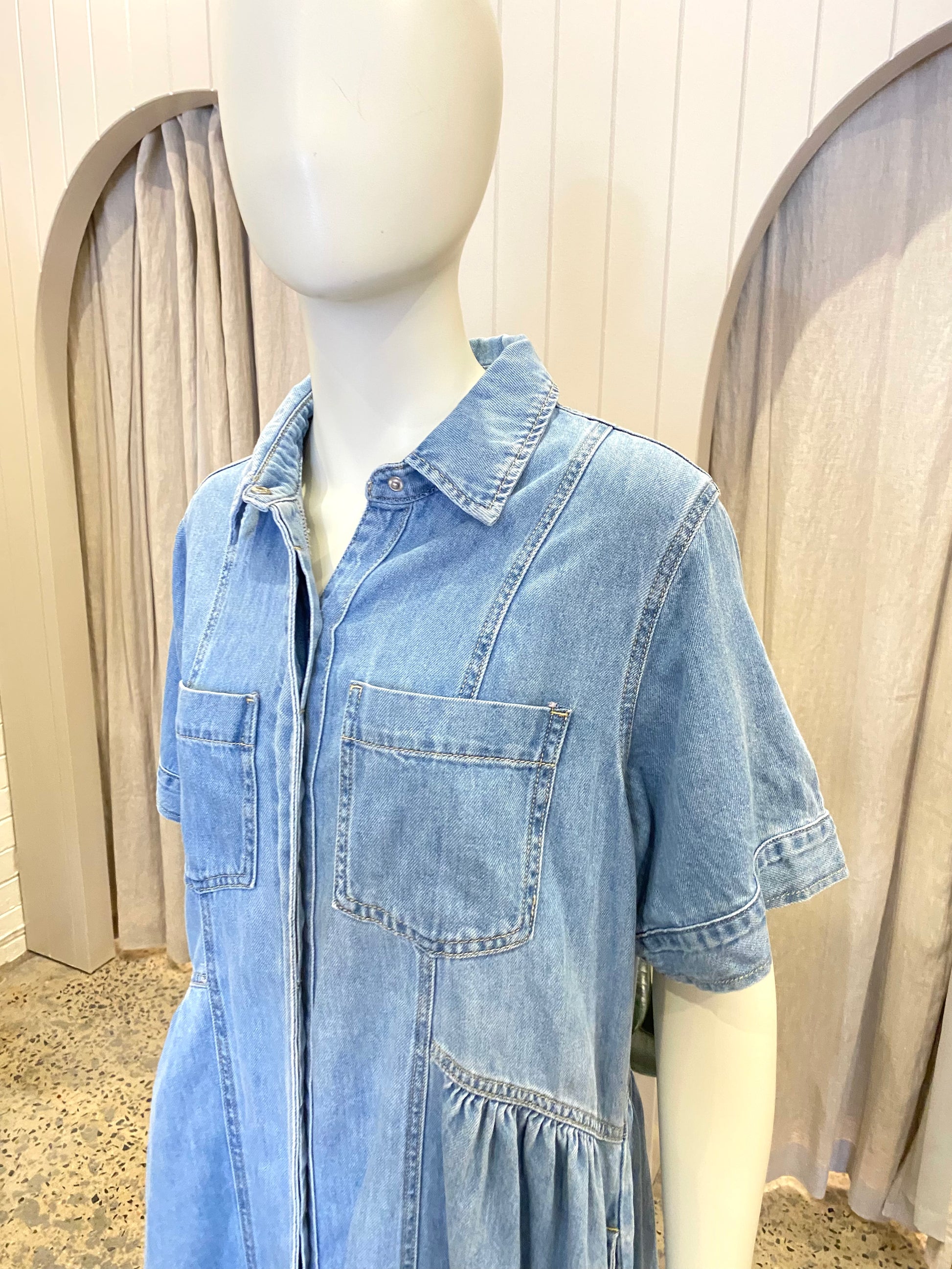 Description : The Montana Denim Shirtdress is the effortless staple your wardrobe has been waiting for. Designed in a soft-washed denim, this midi-length shirtdress drapes beautifully for a relaxed yet elevated feel. Featuring short sleeves, a button-down front, and subtle tailoring, it’s the perfect balance of structure and ease. Designed for all-day comfort with a the relaxed fit on the waist, making it an easy go-to for any occasion.