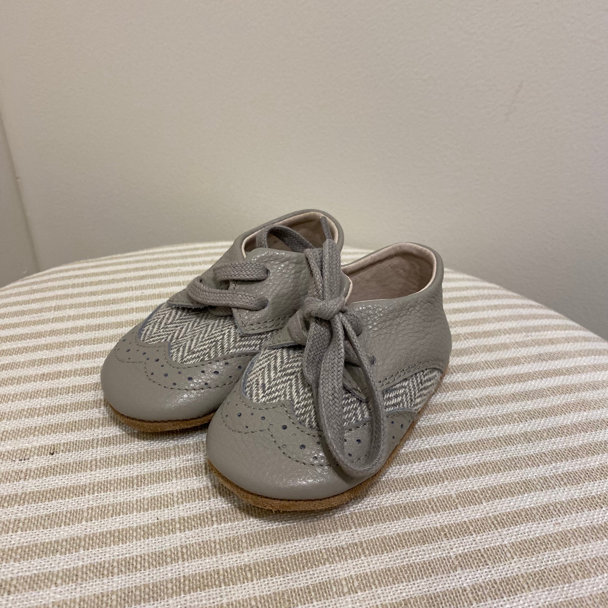Description : These adorable vintage inspired baby soft sole oxfords with rubber grip sections make the perfect unisex shoes. They are made from beautiful soft leather with fabric detailing to ensure your little ones feet are not only stylish but kept comfortable!