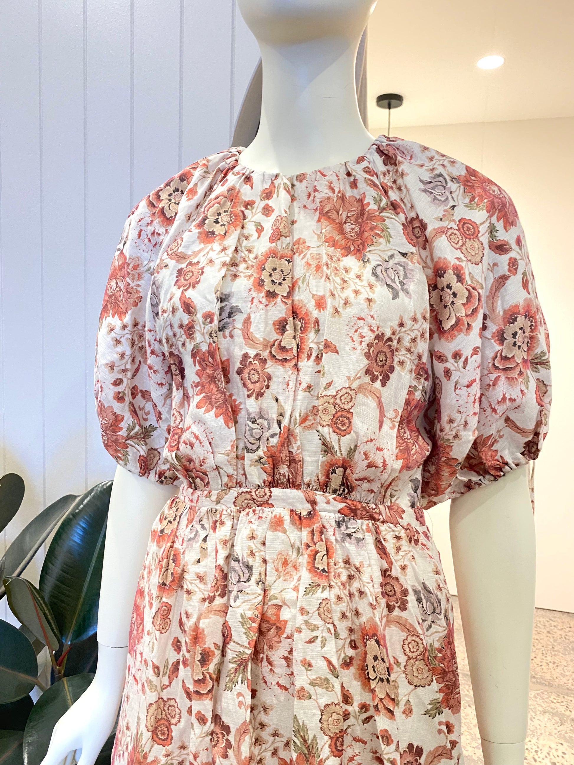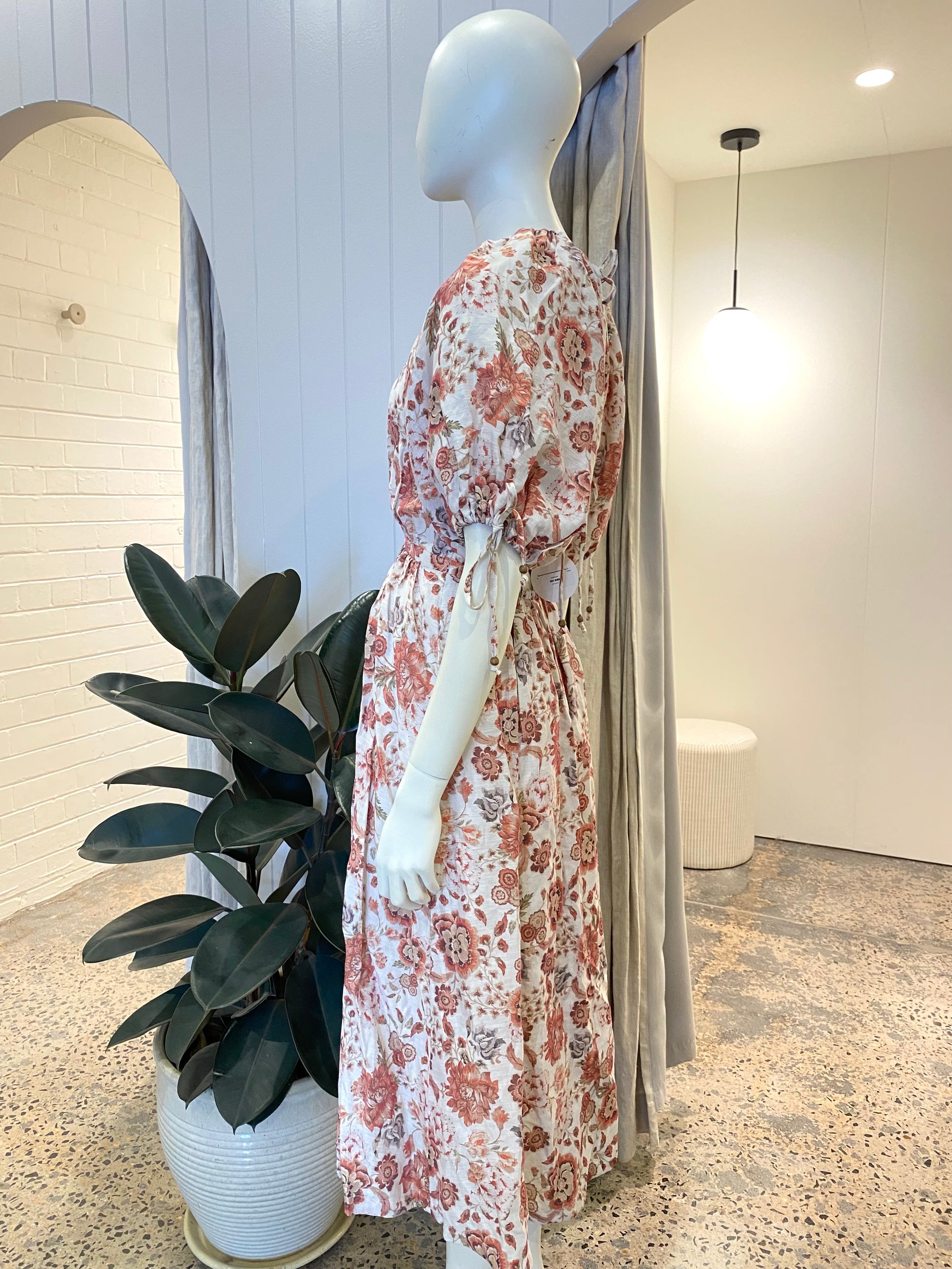 Description : - Midi length - Romantic floral print - Open back with ties - Ruched high neckline - Short blouson sleeve with elastic cuff