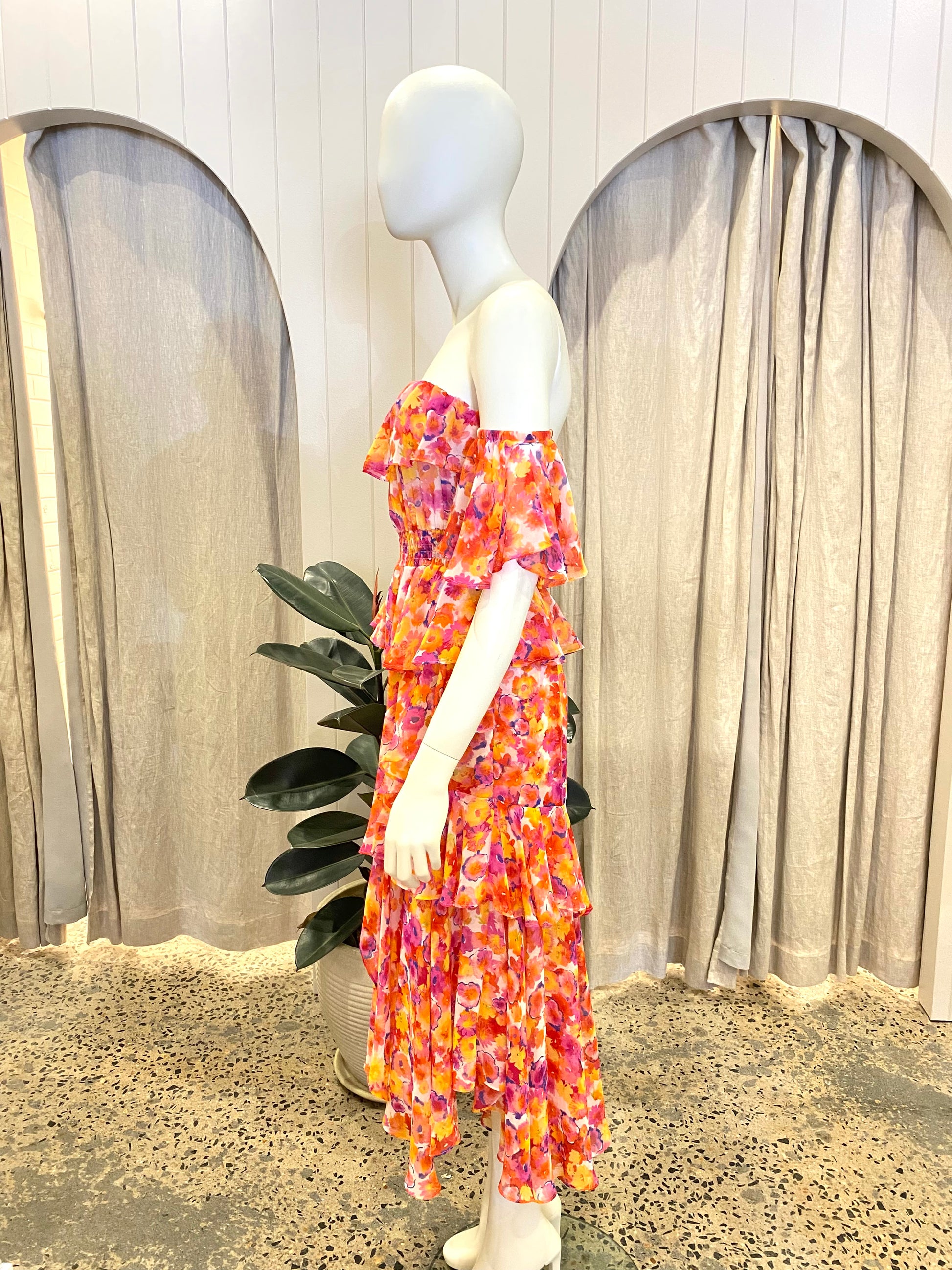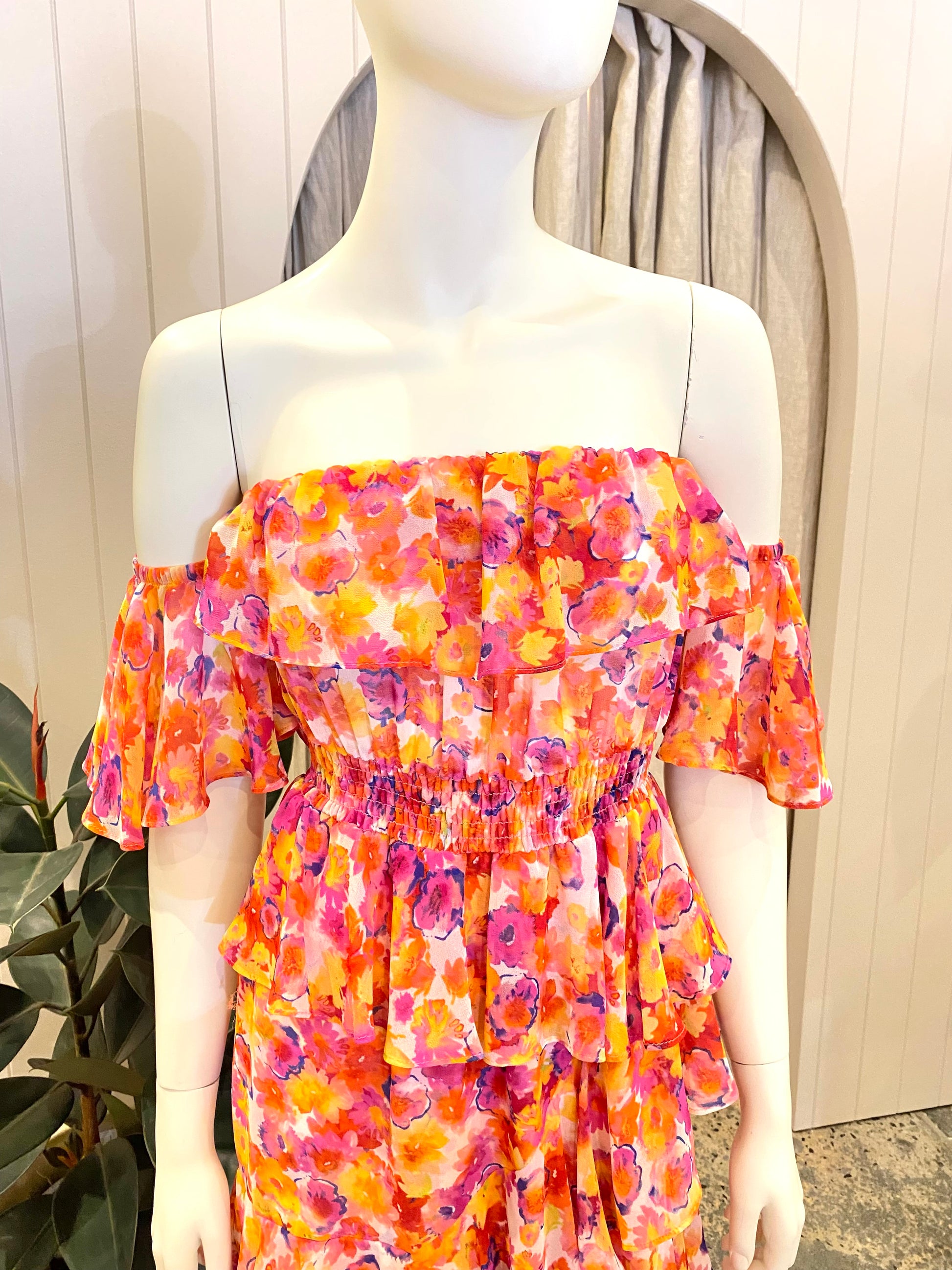 Description : - Bright multi colour floral print - Tiered ruffle skirt - Off-the-shoulder style