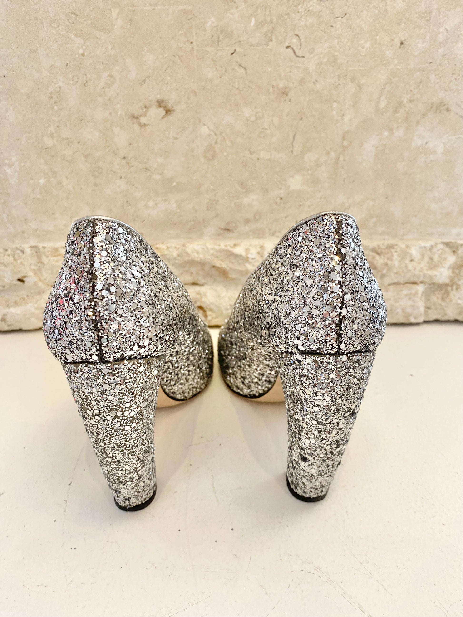 Description : - Rounded toe - All over silver glitter - Block heel approx. 11cm - Plaform foot