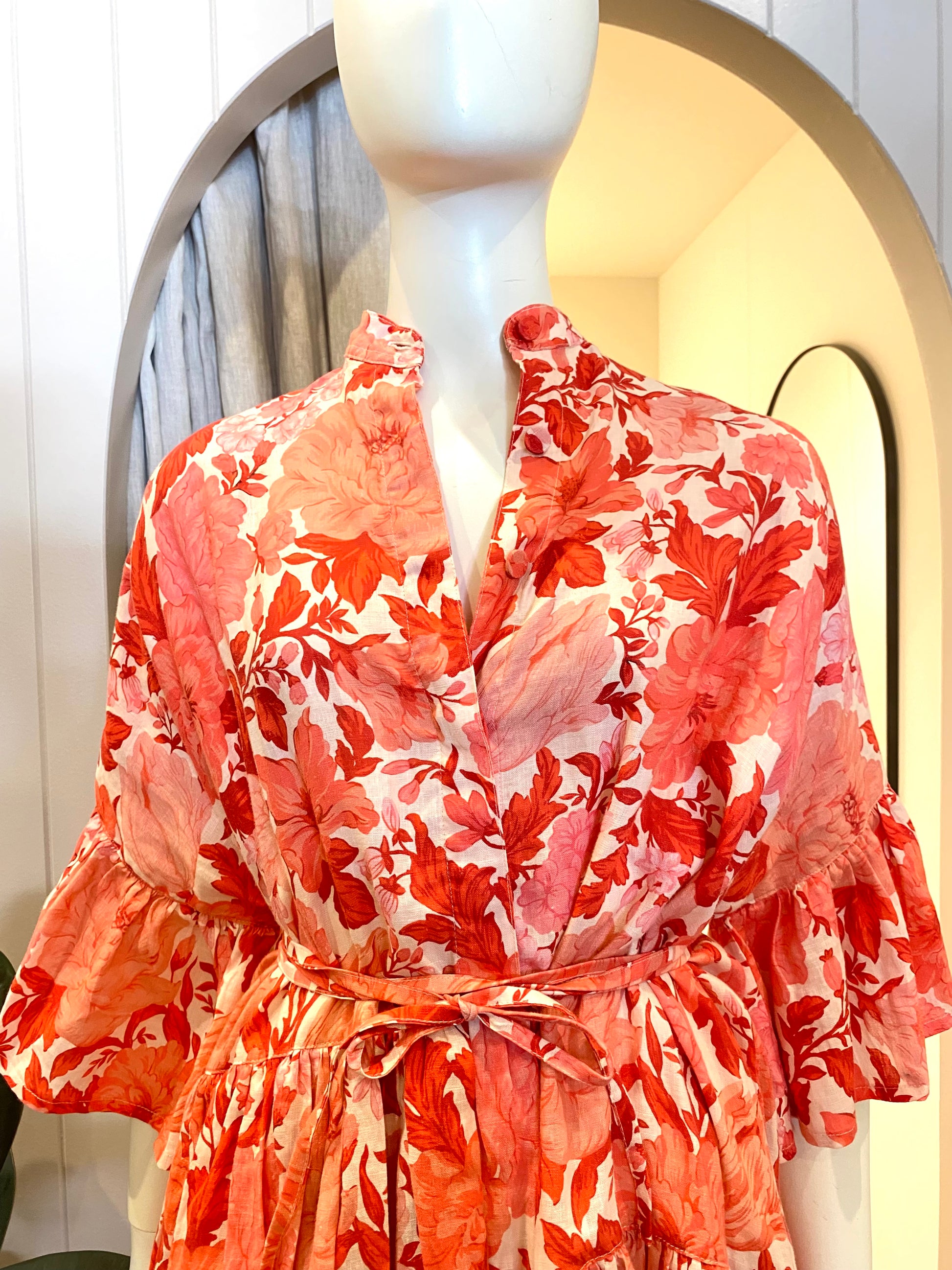 Description : - All-over floral print - Frill sleeves - Front button fastening - Tiered skirt - Detachable belt - Stand collar