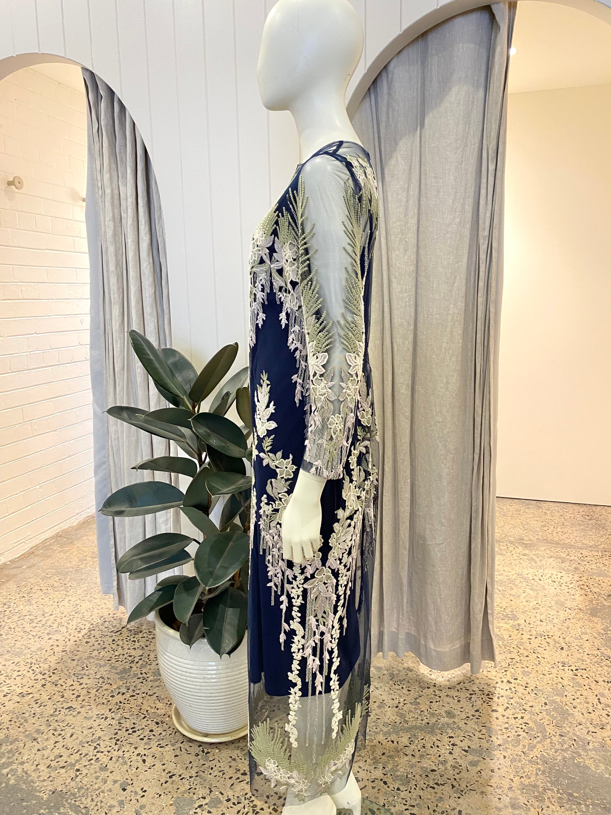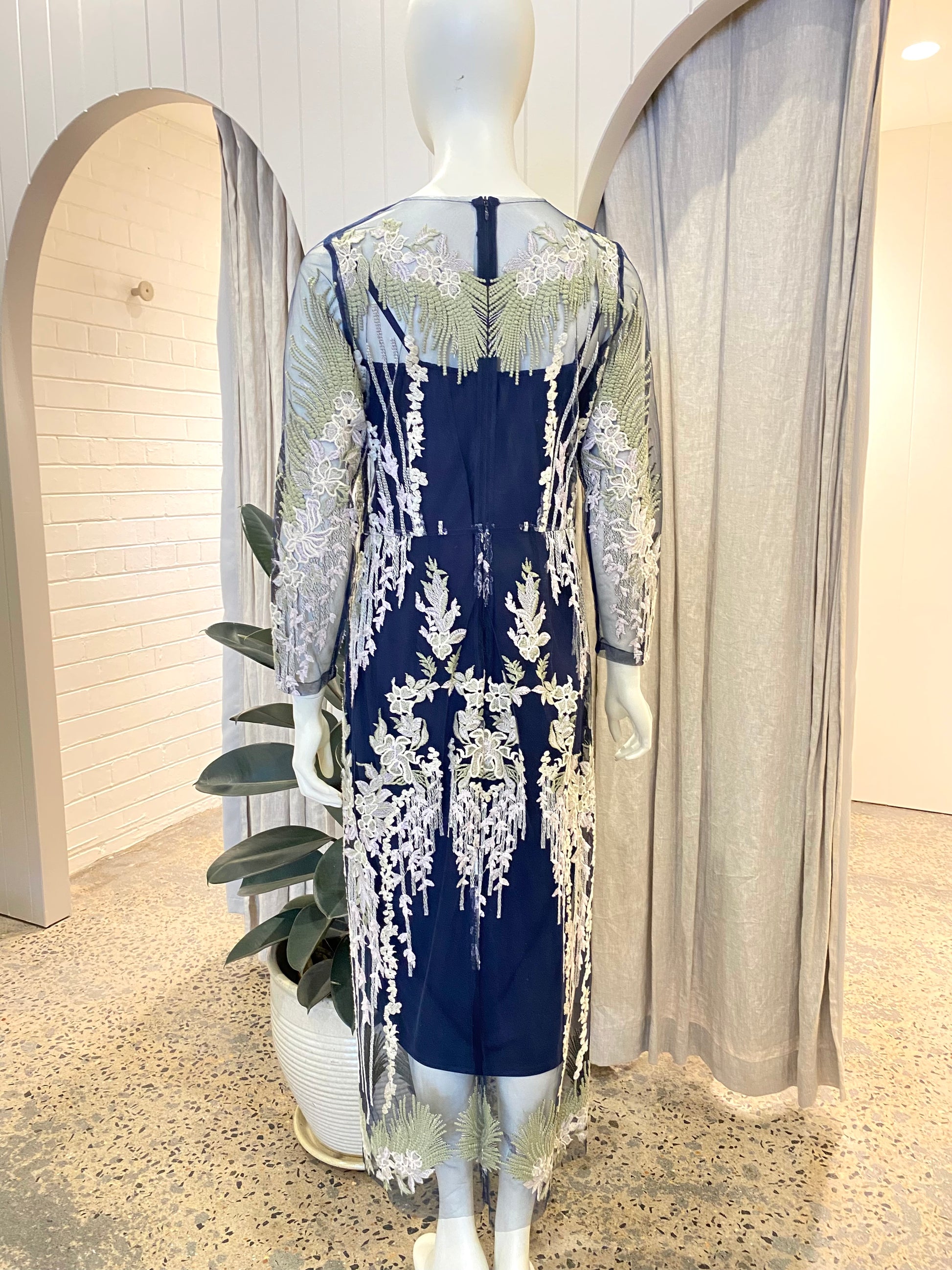 Description : The Lavender Dress is crafted on a fine navy tulle, intricately embroidered with hints of lilac, mint and ivory. Designed to hug the body through the torso falling into a straight ankle length skirt, the shift dress features long sleeves where the embroidery details leave bare tulle on the shoulders and allow for a flattering round neckline, with a centre back split and invisible zip closure. - Comes with separate jersey slip