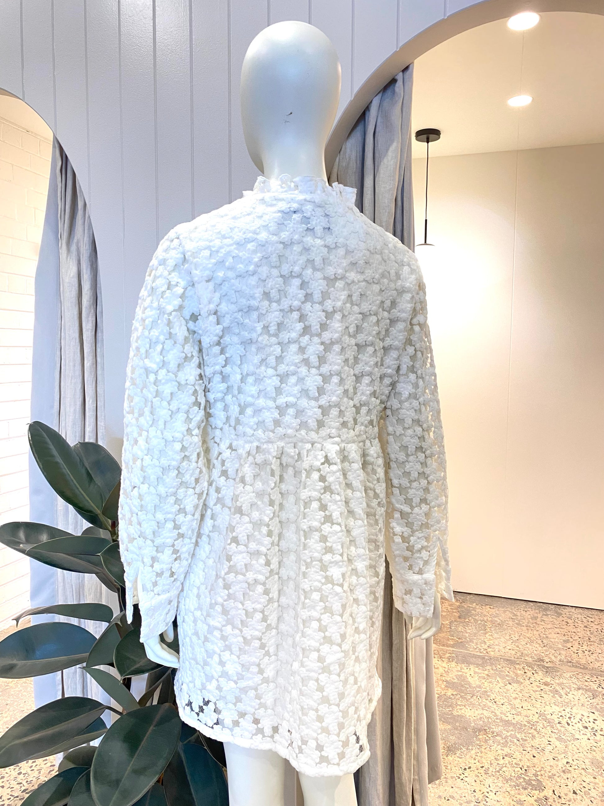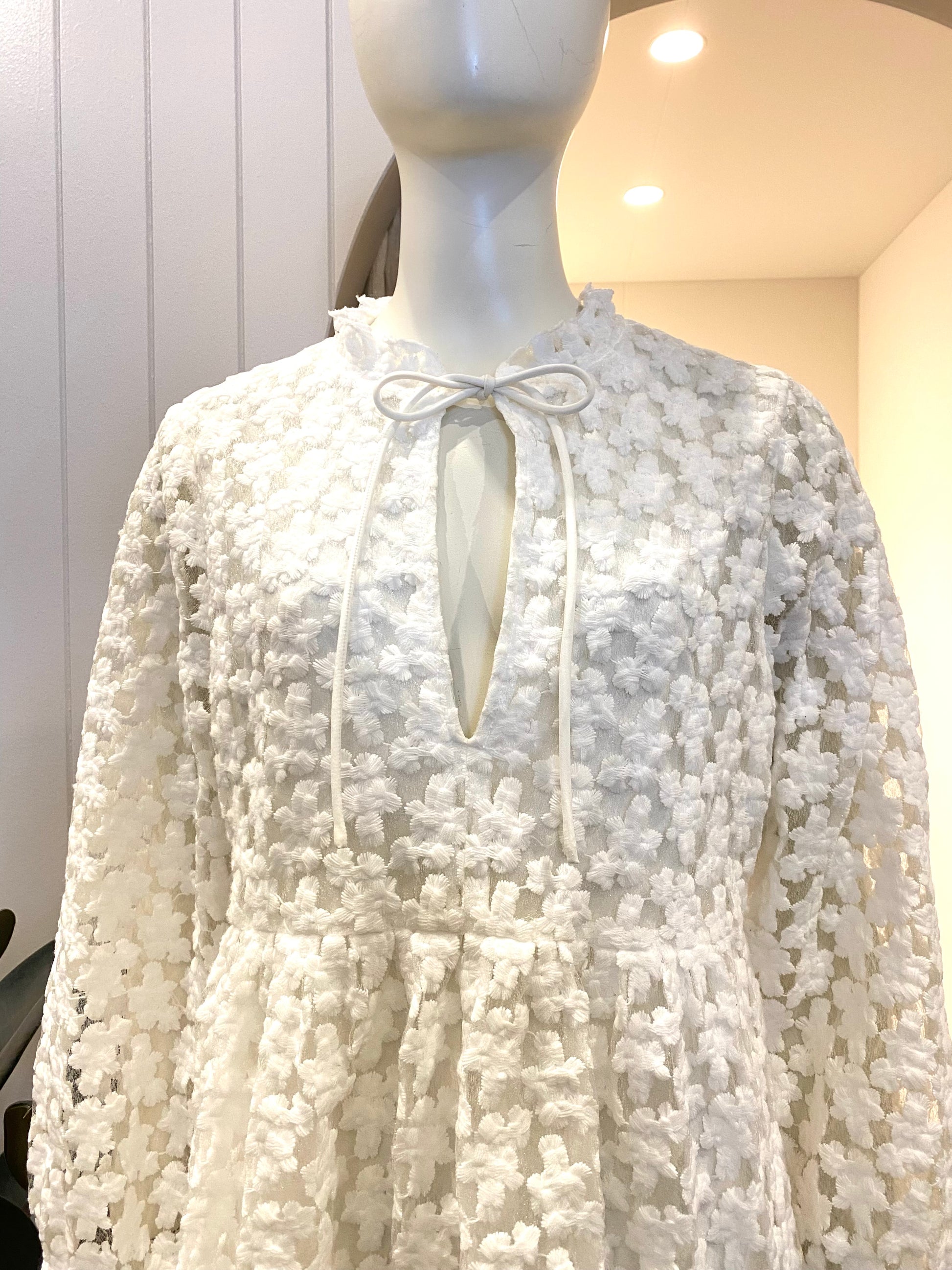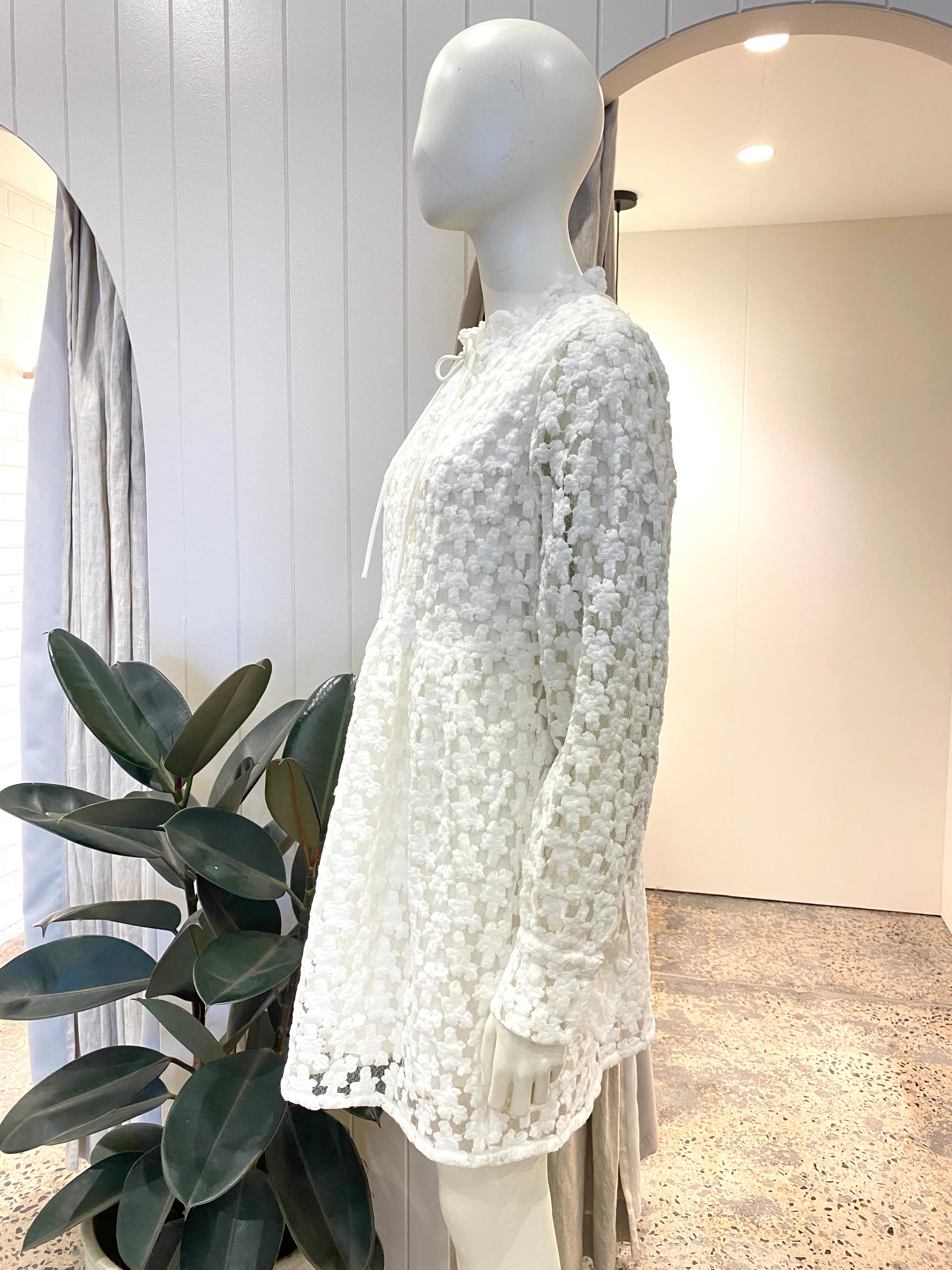 Description : - White lace fabrication - Sheer voluminous sleeves - Deep v-neckline - stand collar with neck tie