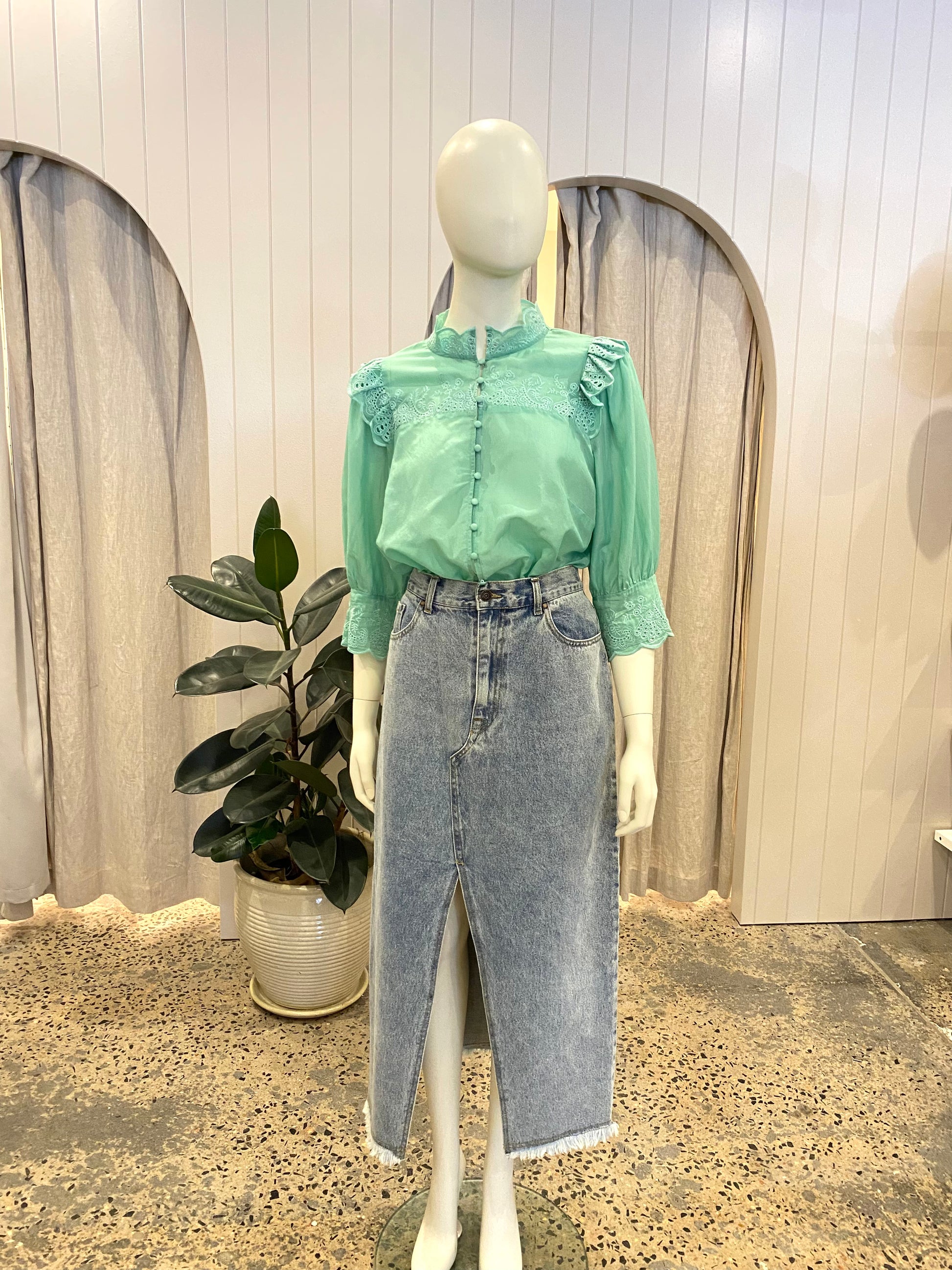 Description : - Broderie anglaise detailing - Button cuffs - Stand collar - Sheer fabrication