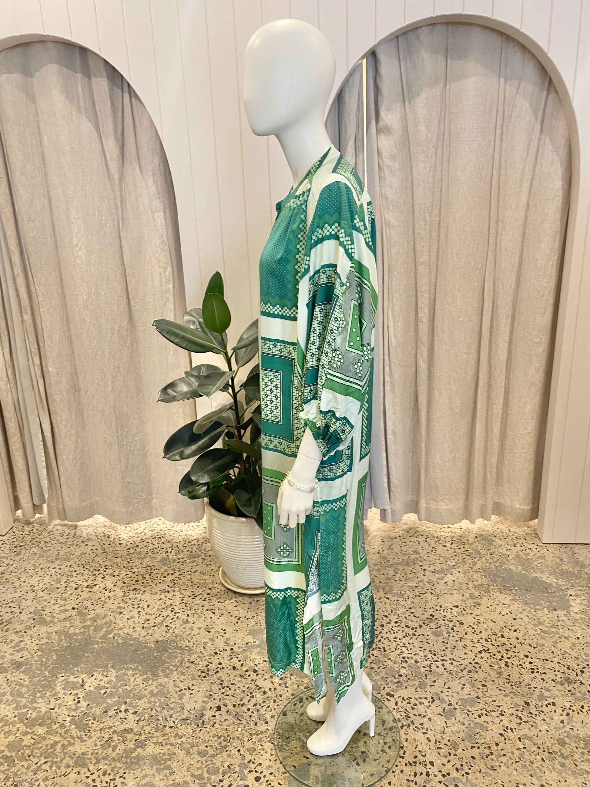 Description : Green print midi dress Round neckline Front button down Side slip pockets Long blouson sleeve with elastic cuff Side splits