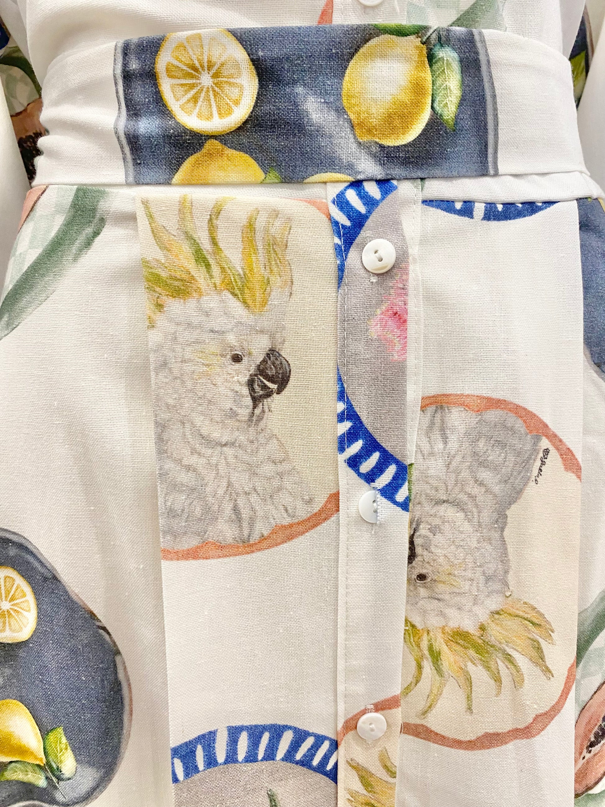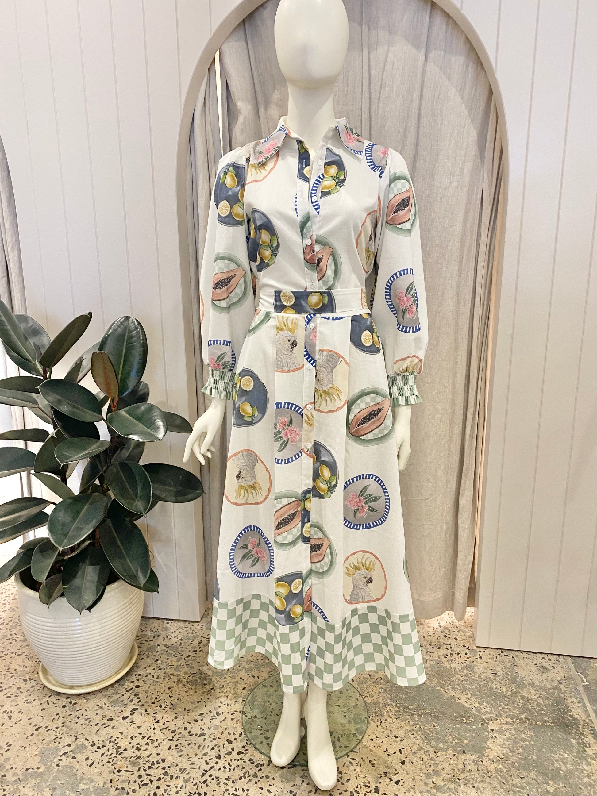 Description : Long sleeve blouson sleeves with elasticated cuffs, pointed collar, button down, waist belt