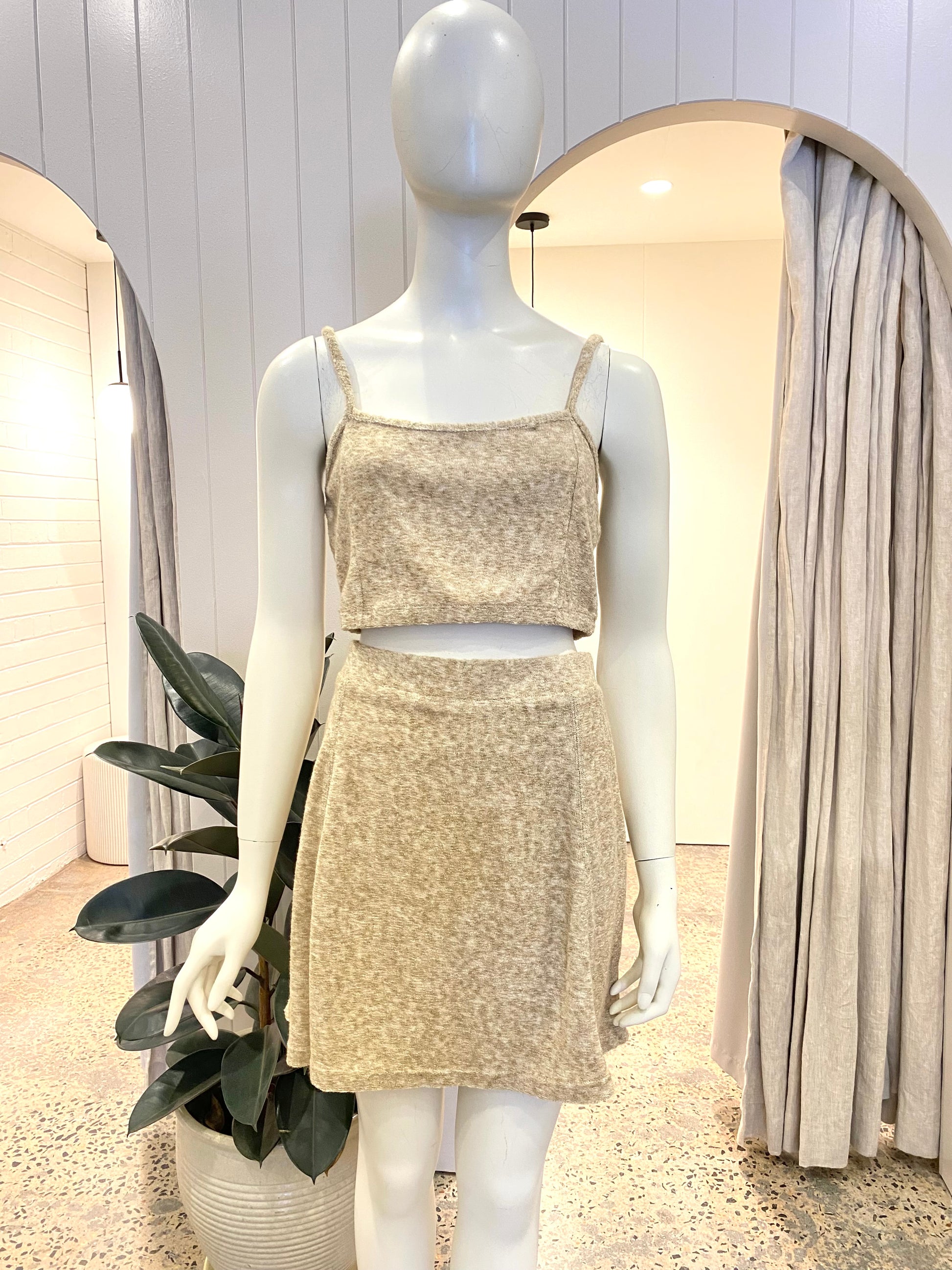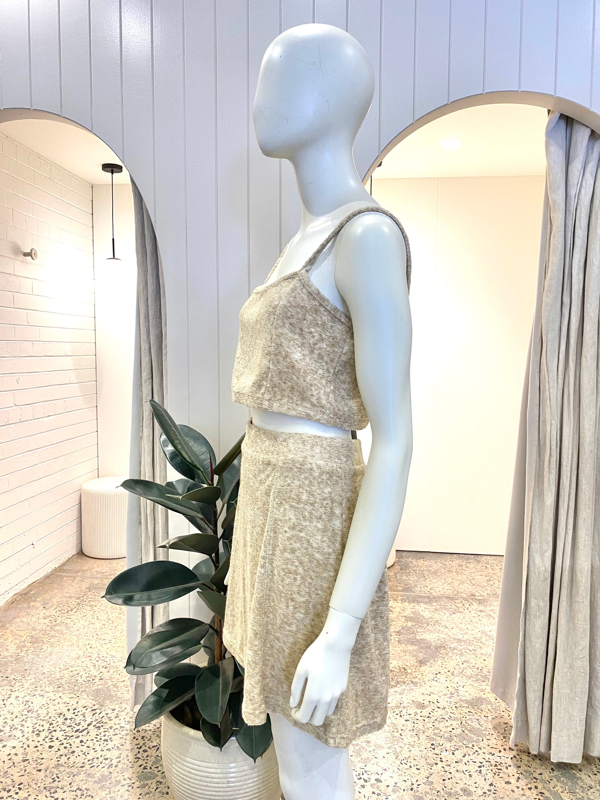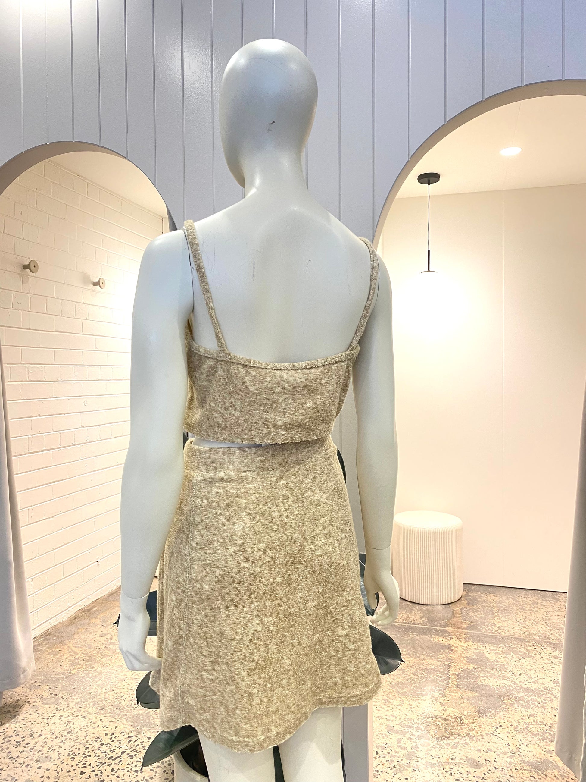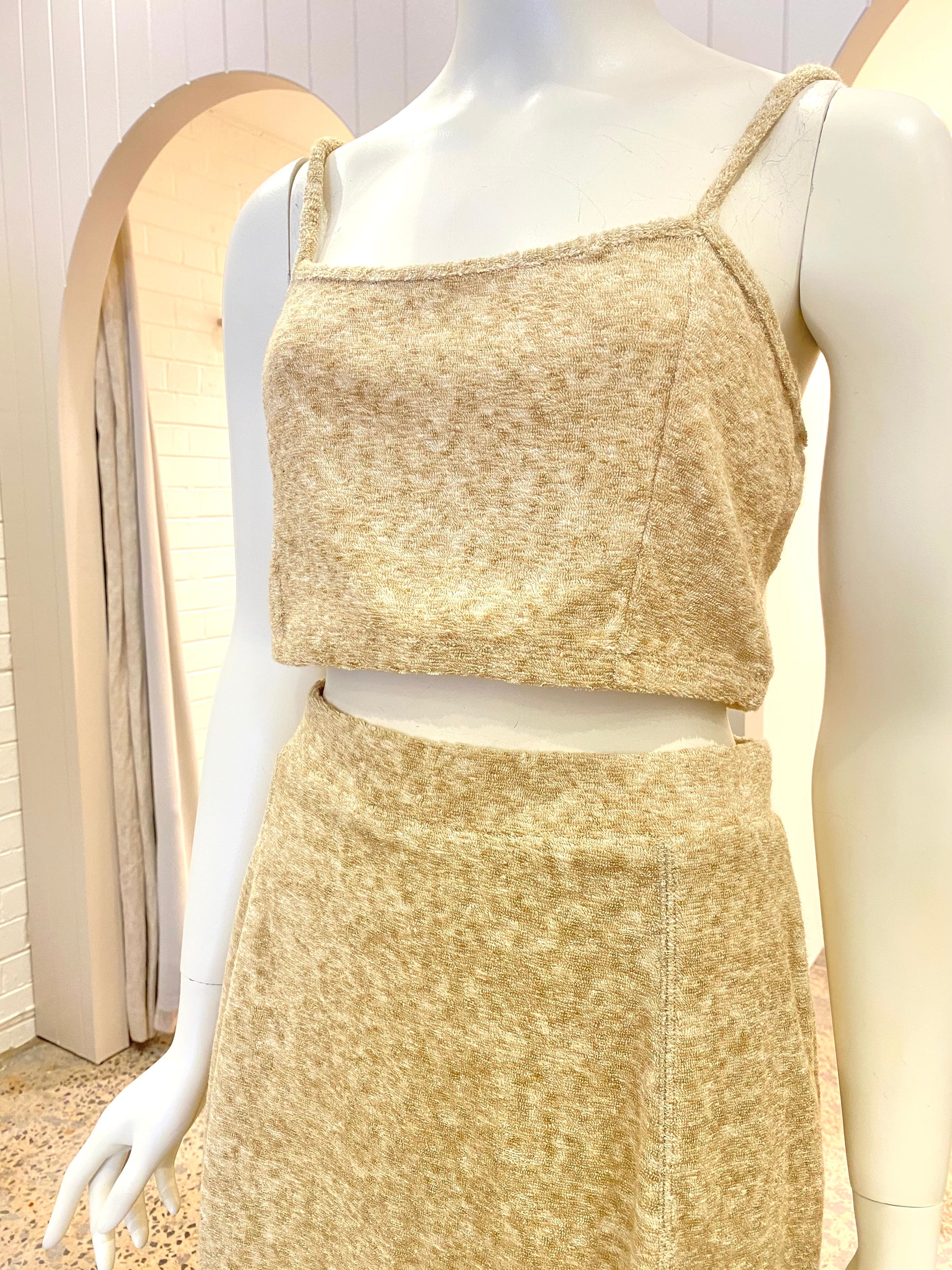 Description : A cute little co-ord set, perfect for sunny days. Featuring a crop top and tennis skirt in a llightweight, stretch Japanese Terry Towelling cotton.