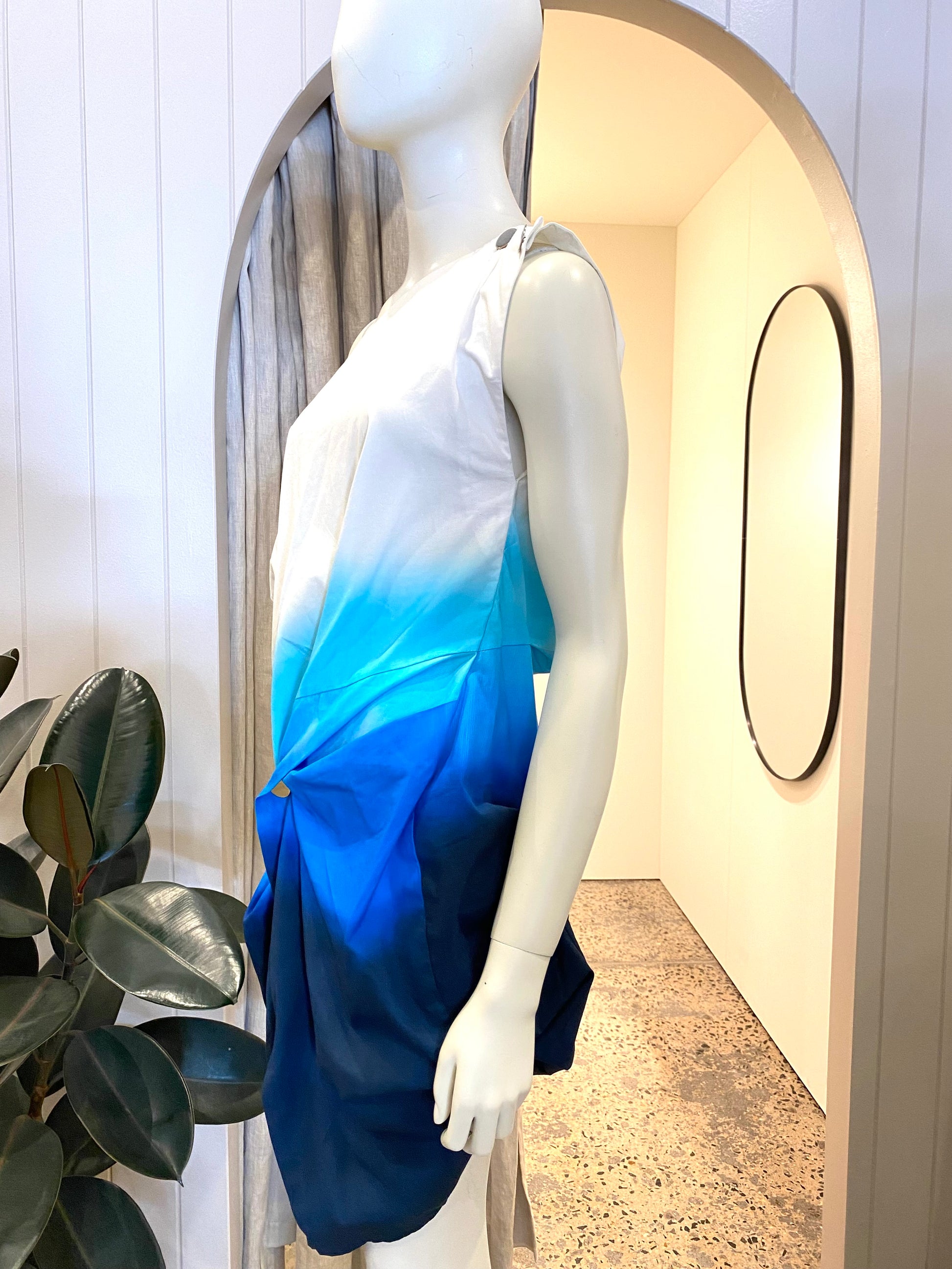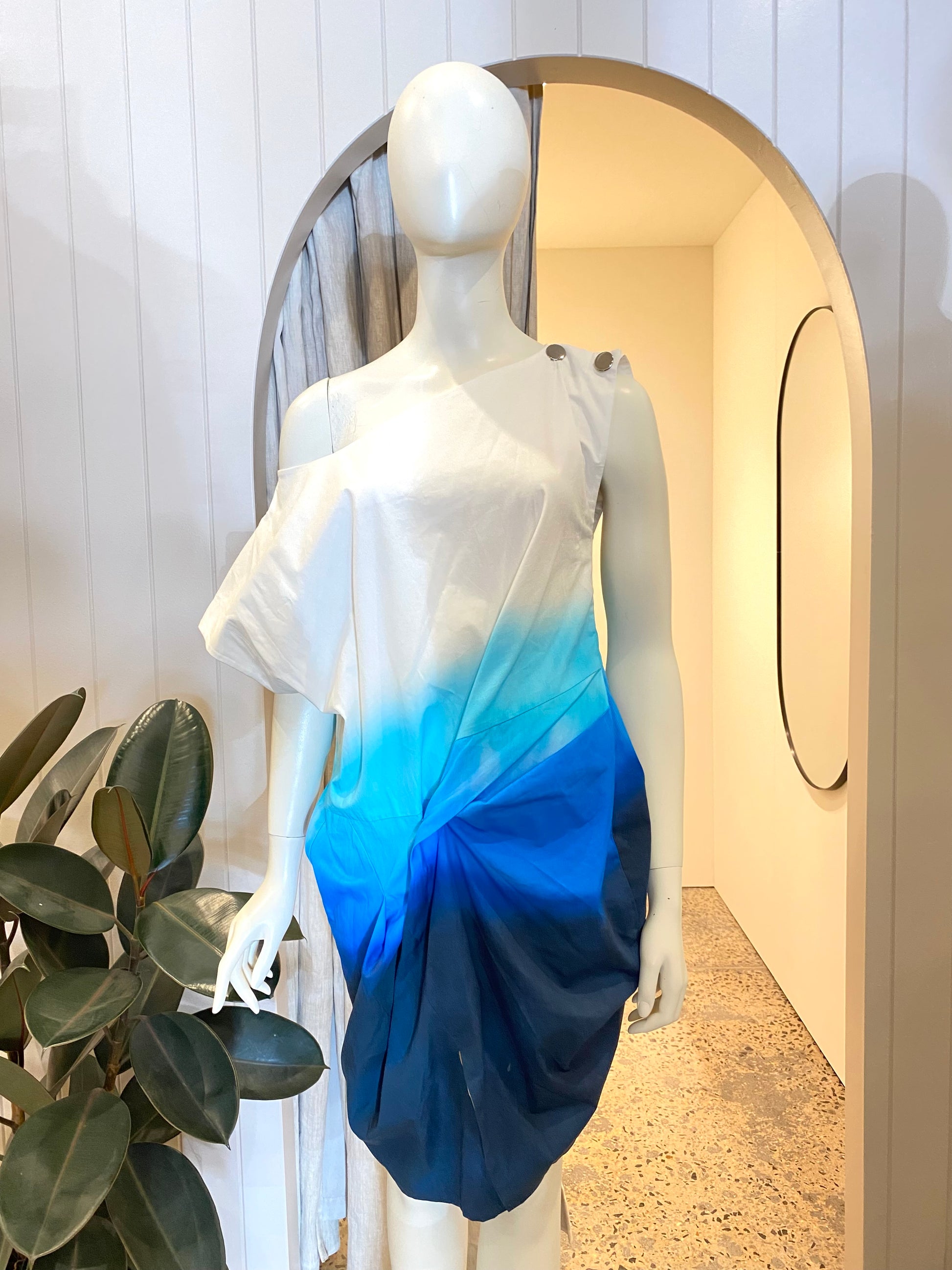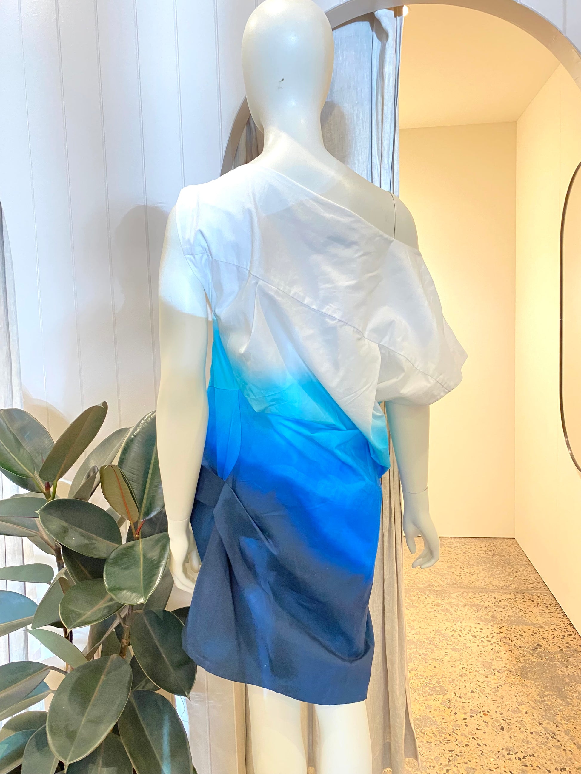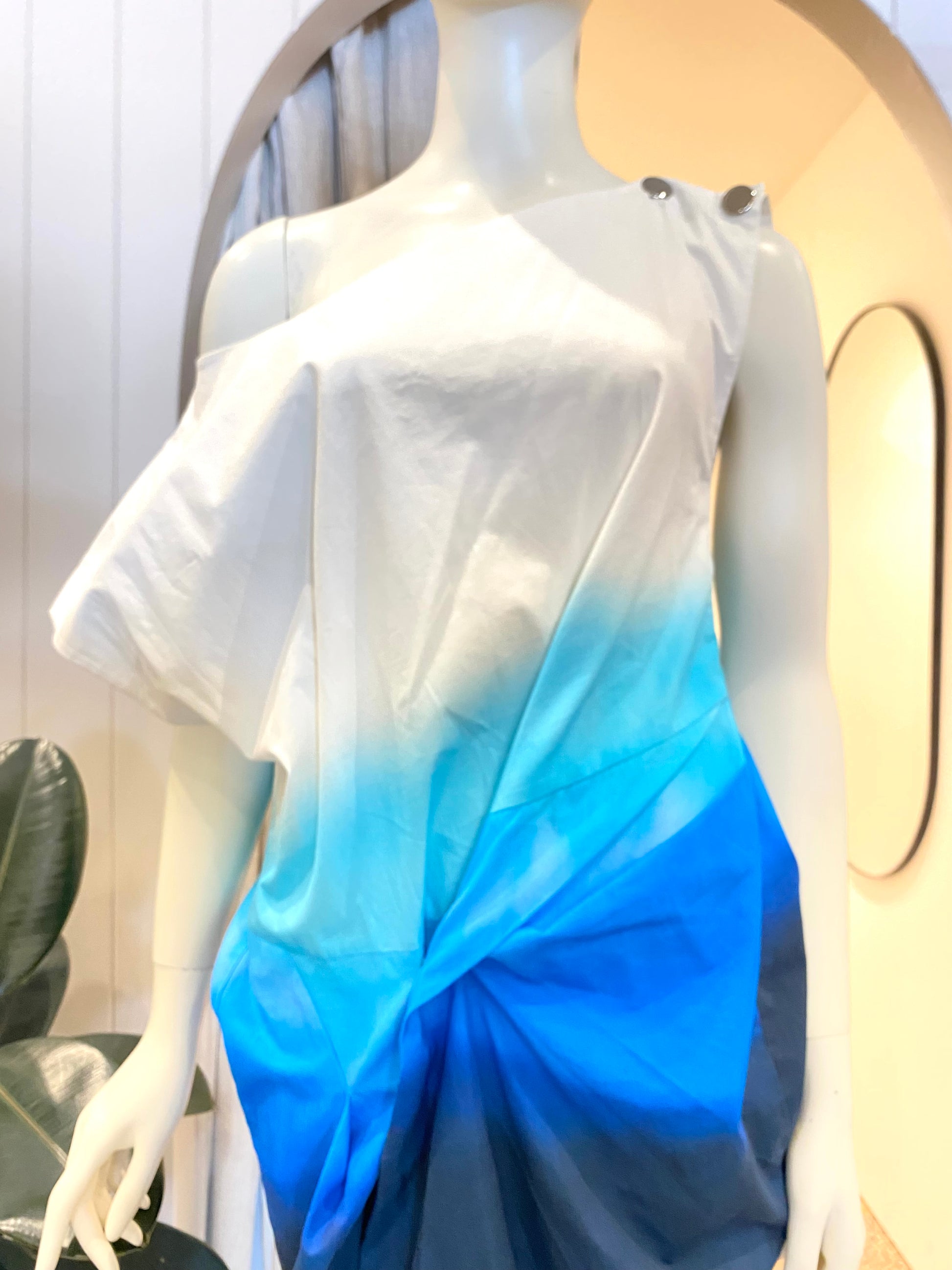 Description : - 100% cotton poplin. - Engineered Dip Dye print - Can be unbuttoned and pulled off one shoulder - Features mottled statement buttons - Asymmetric hem - Side split - Mini Length