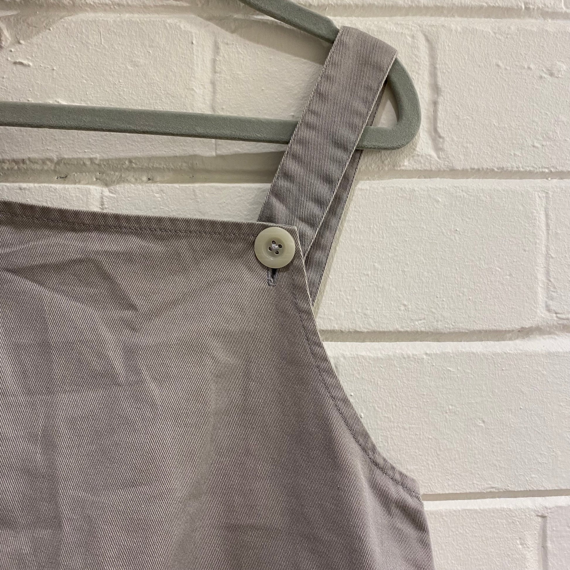 Description : taupe overalls, button straps, elastic back stretch