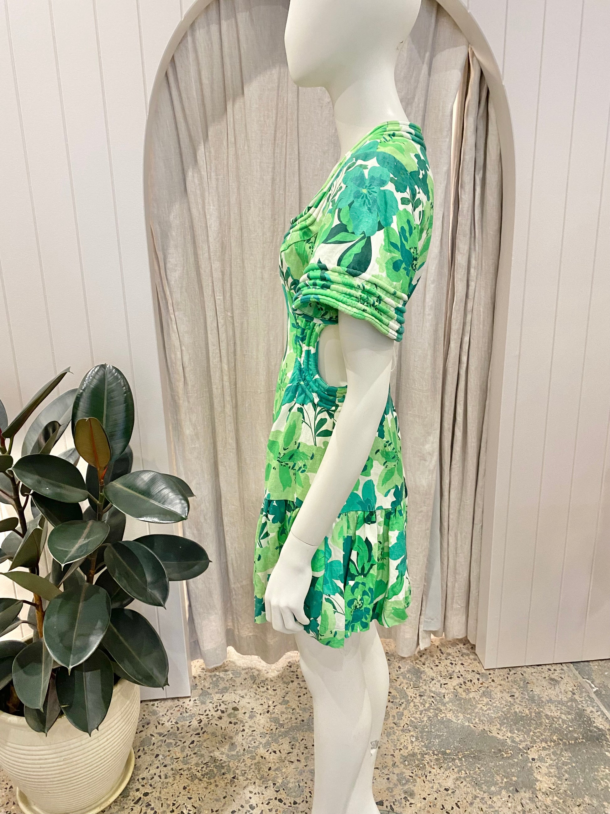 Description : The eye-catching Marguerita Mini Dress is made from a breathable linen blend, has feminine short sleeve with trumpet hem, round neckline, cut-outs at side waist, zip fastening at back and is lined. The perfect dress to wear during the day, dress up or down with sandals or heels