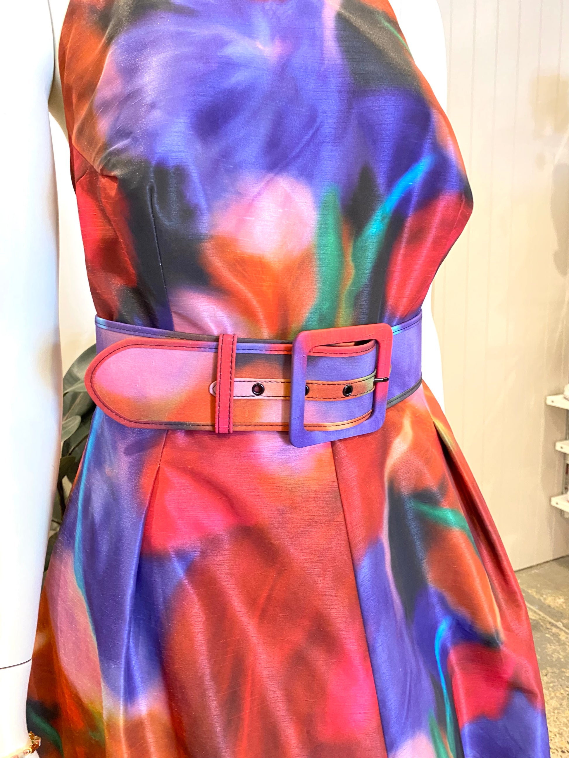 Description : Taffeta Halter Gown Halter Neckline Fitted Bodice Open Back with Neck Tie Self Belt Circular Skirt with Inverted Tucks Invisible Zip Fastening at Back Dress is Lined RRP $1099