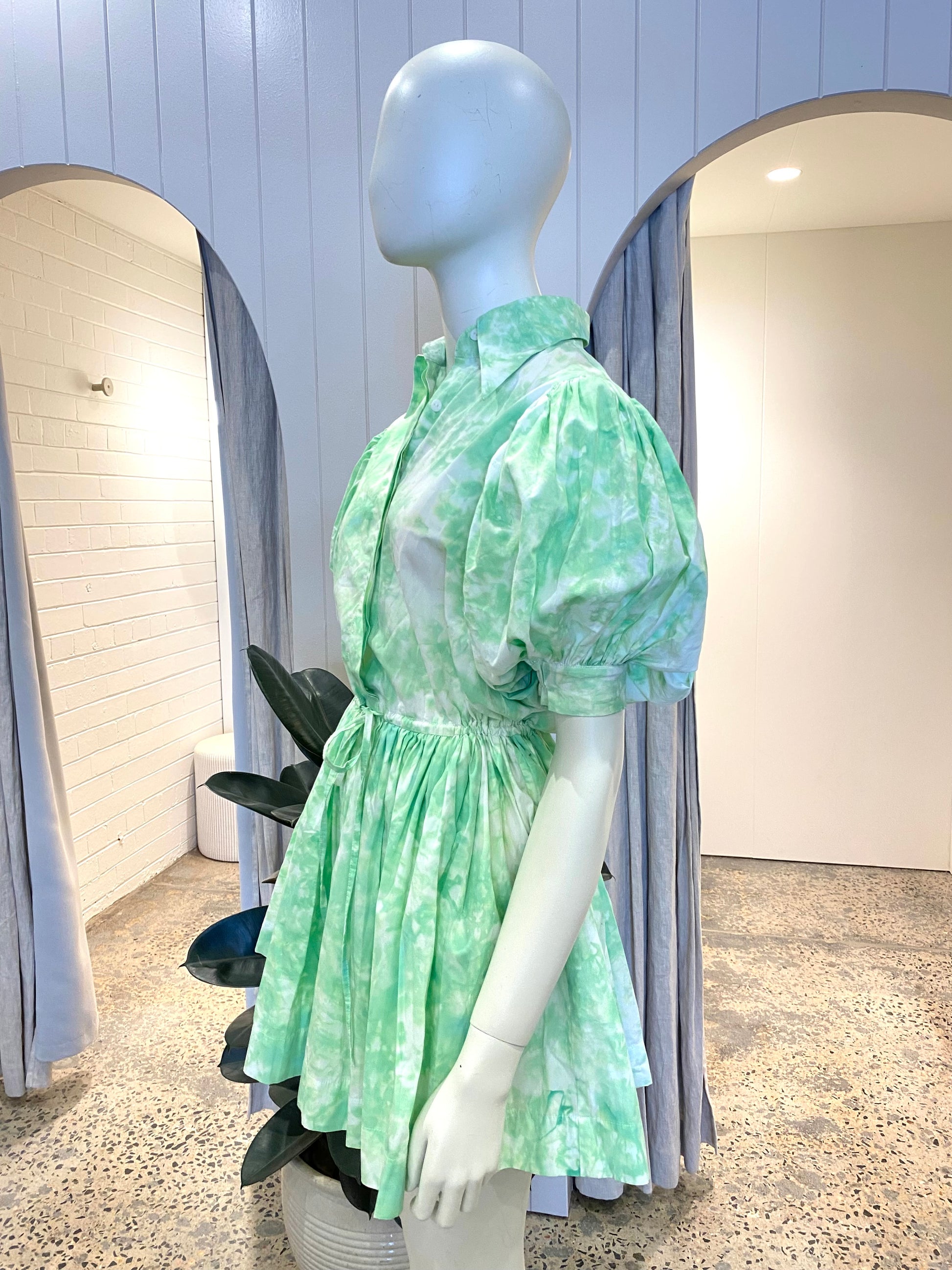 Description : classic collar, puffed sleeves and buttons through the body, drawstring at the waist, before dropping to a full mini skirt