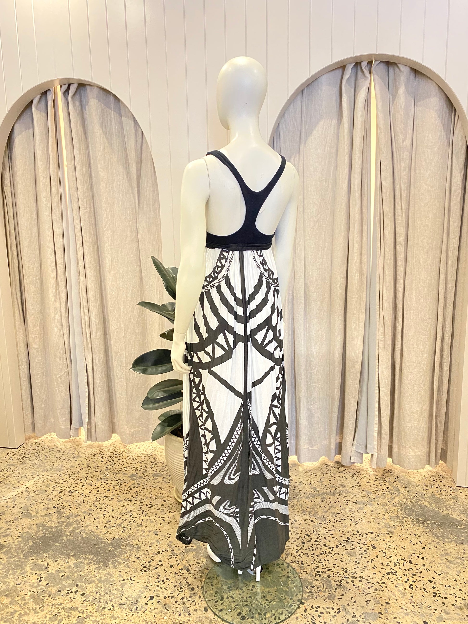 Description : - black racer back top, black and white geo print skirt - maxi length