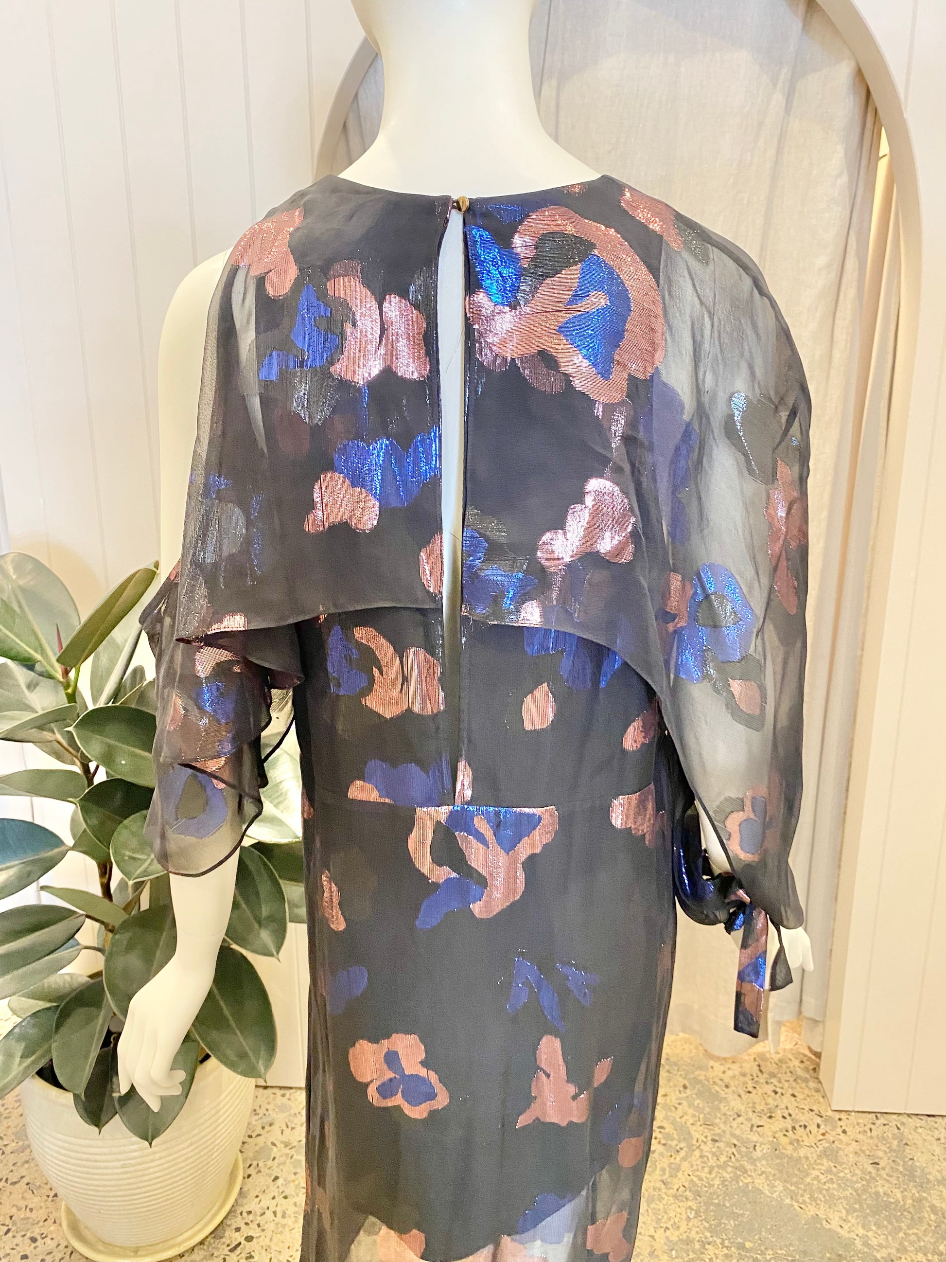 Description : black sheer dress with metallic detailing, V-neckline, fully lined, asymmetrical hem, sleeveless, back keyhole and button closure
