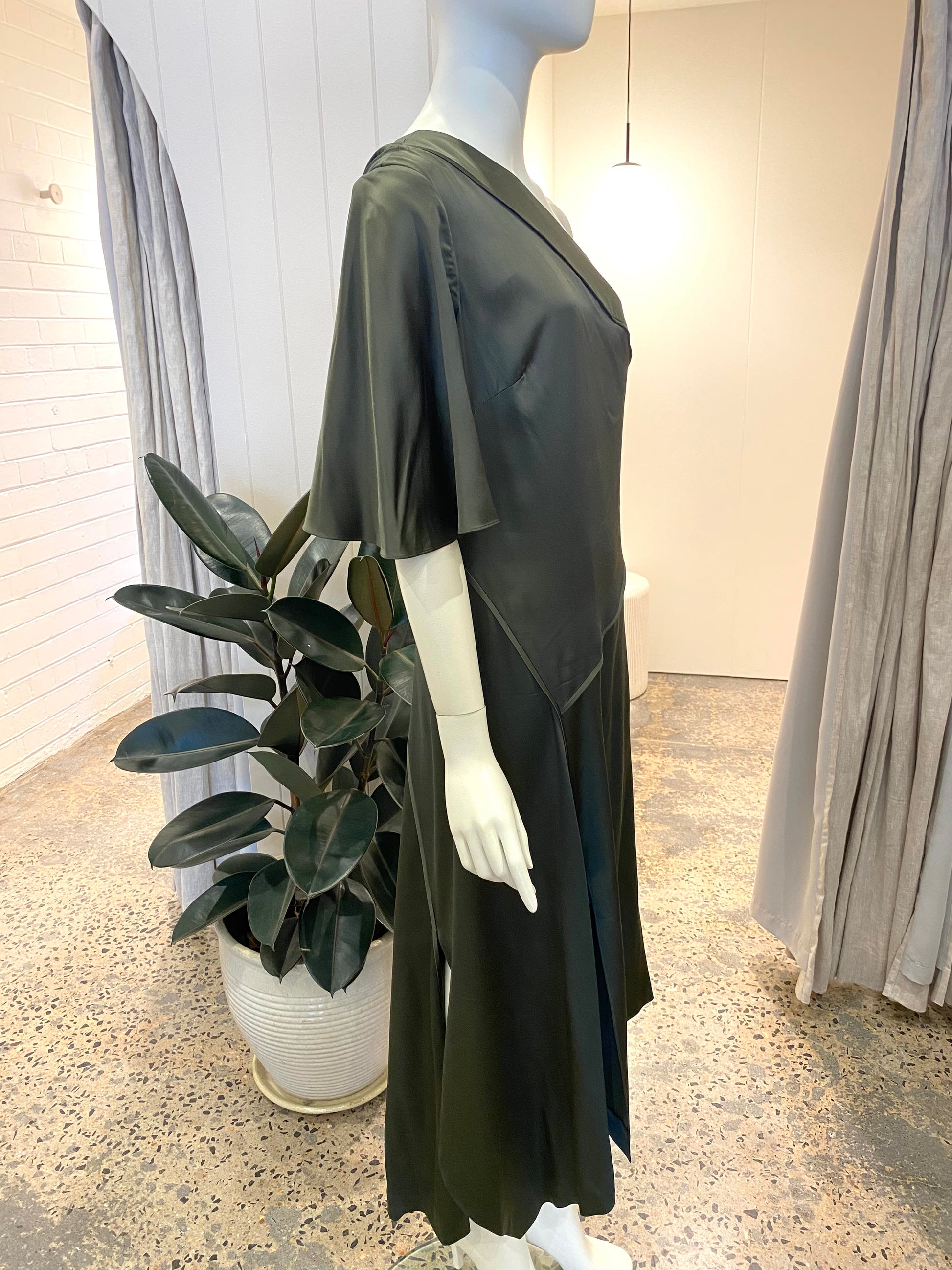 Description : One shoulder maxi dress with a single flared sleeve, asymmetric panelling with piped seam detailing, and a flared asymmetric handkerchief hem. Fastening at the side with an invisible zip closure, the dress flaunts a rich olive colouring, made from soft Italian fabric.