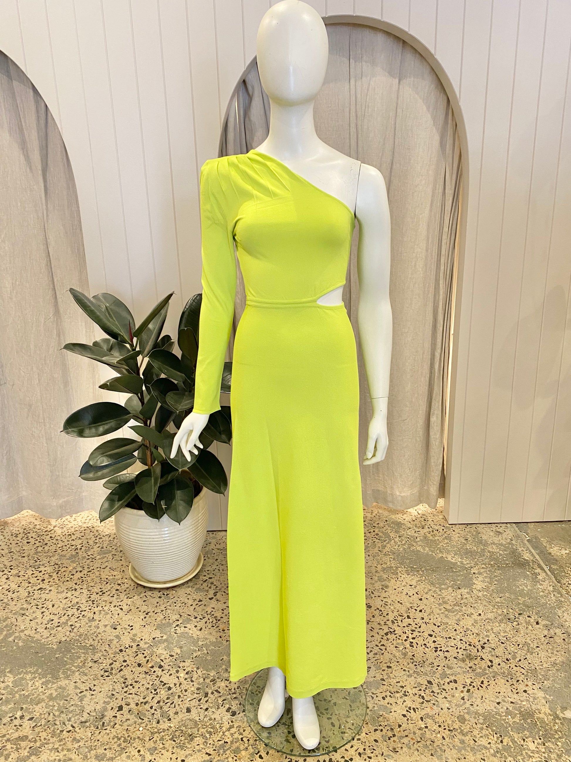 Description : Crafted from Scanlan Theodore's signature lightweight micro Crepe Knit fabrication in a vibrant neon colourway, the one-shoulder, long-sleeve silhouette exemplifies modern allure. Detailed with a cut-out on the waistline and gathered detail on the shoulder, the full-length gown offers timeless sophistication.