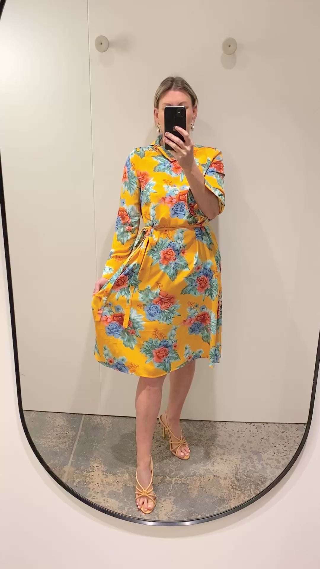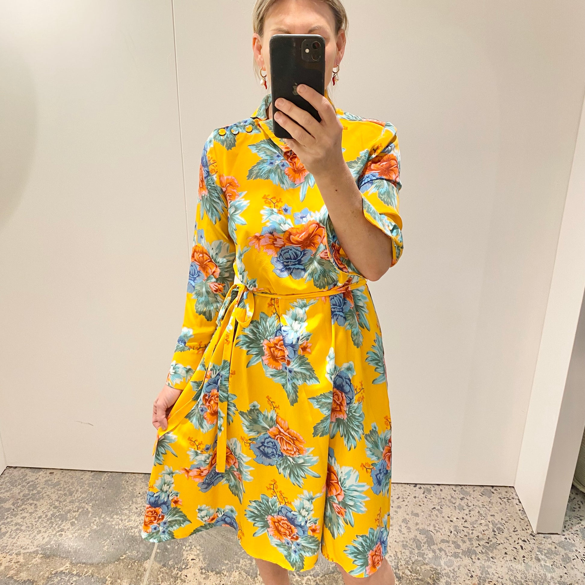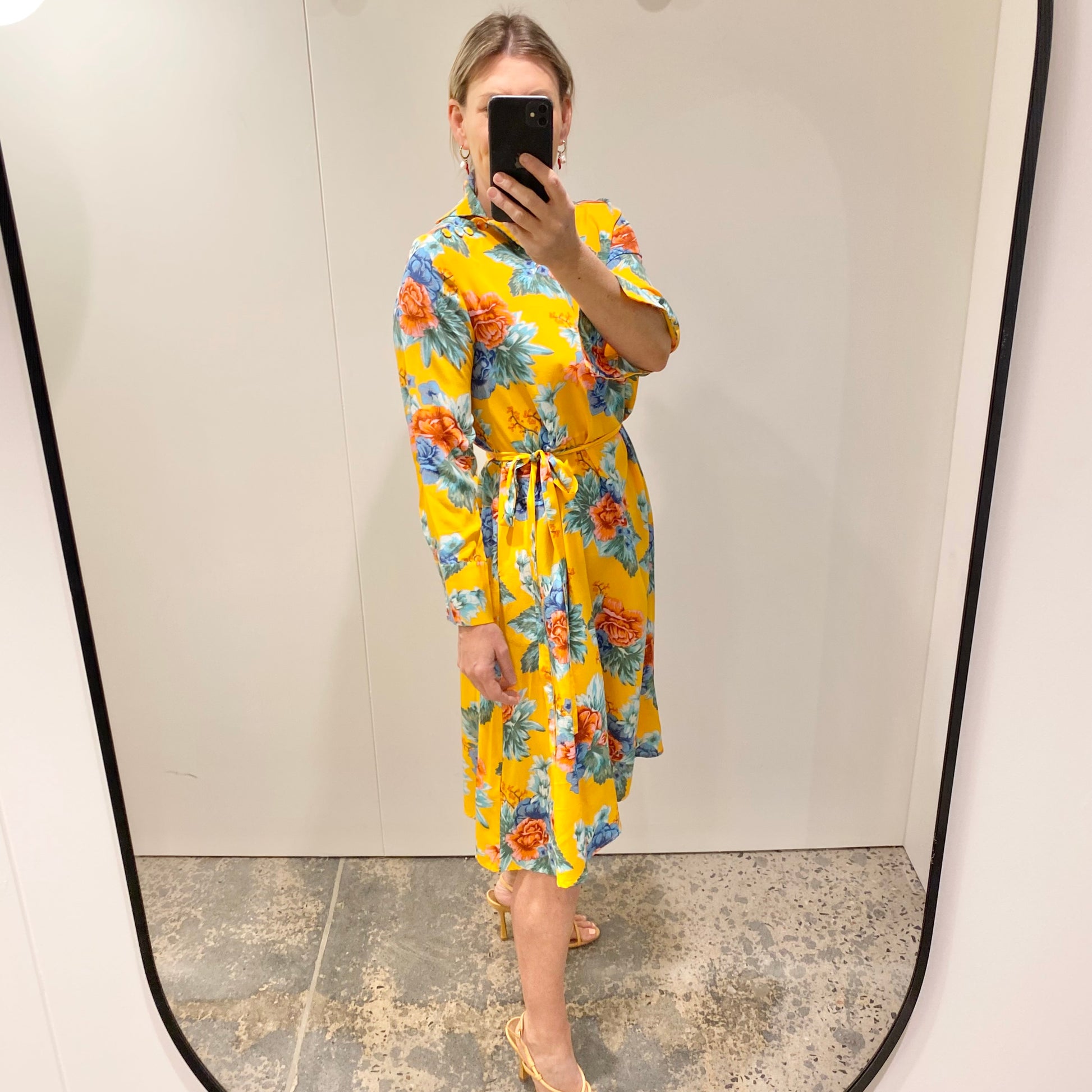 Description : - High asymmetric neckline - Floral print on a yellow background - Split cuff, b utton closure - Matching silk self tie belt