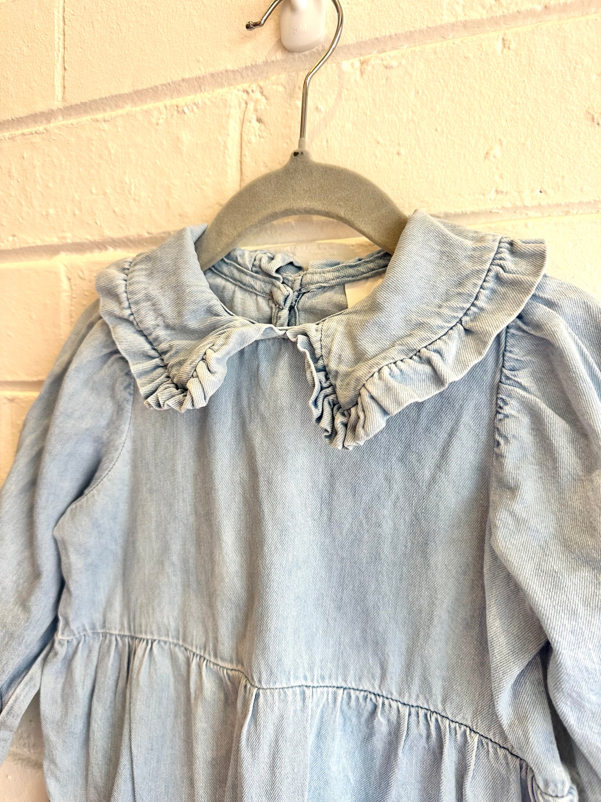 Description : smock dress, denim blue, ruffle peter pan collar, long sleeves
