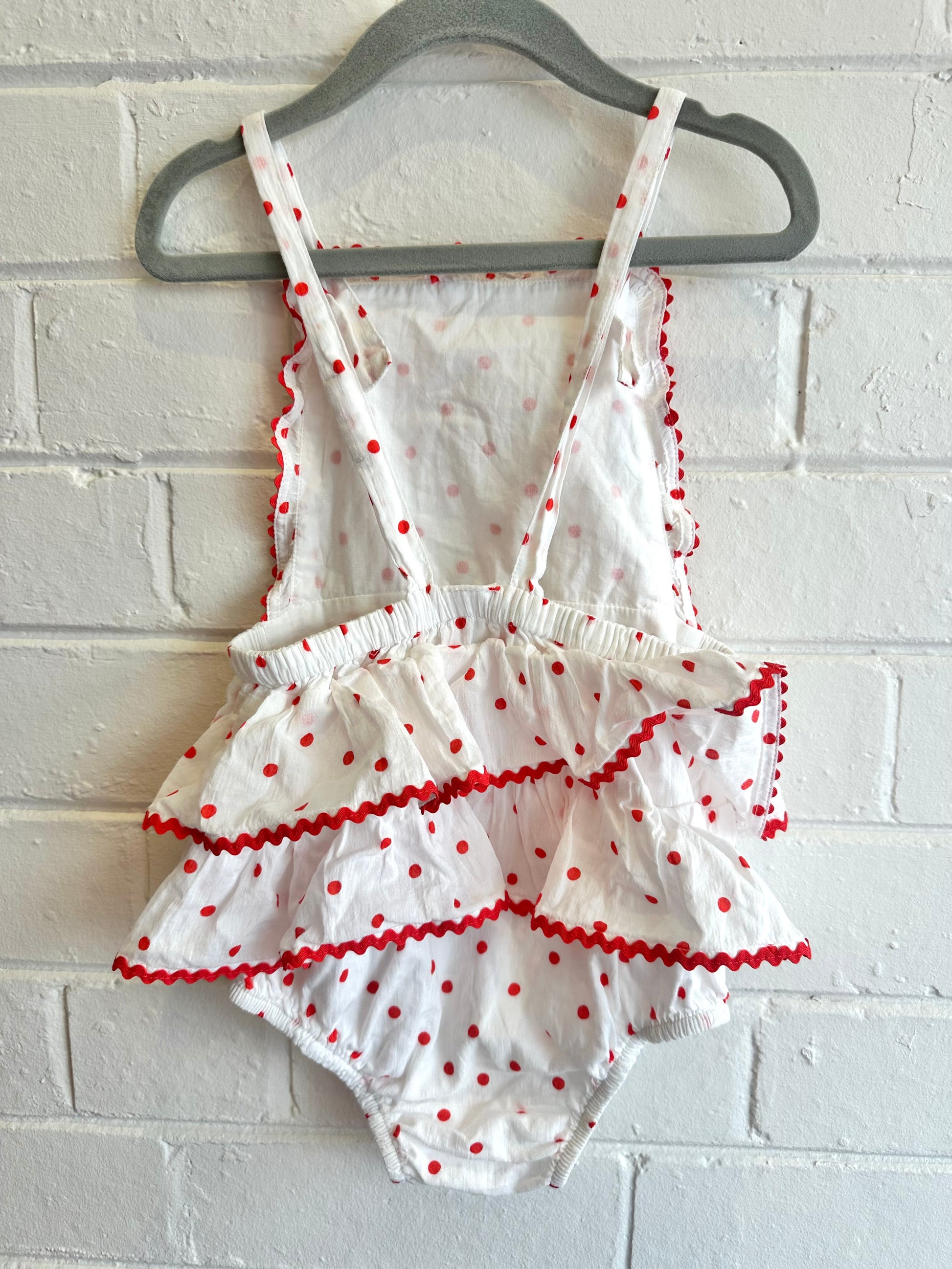 Description : red polka dot onesie, scallop ruffles, snap button closure