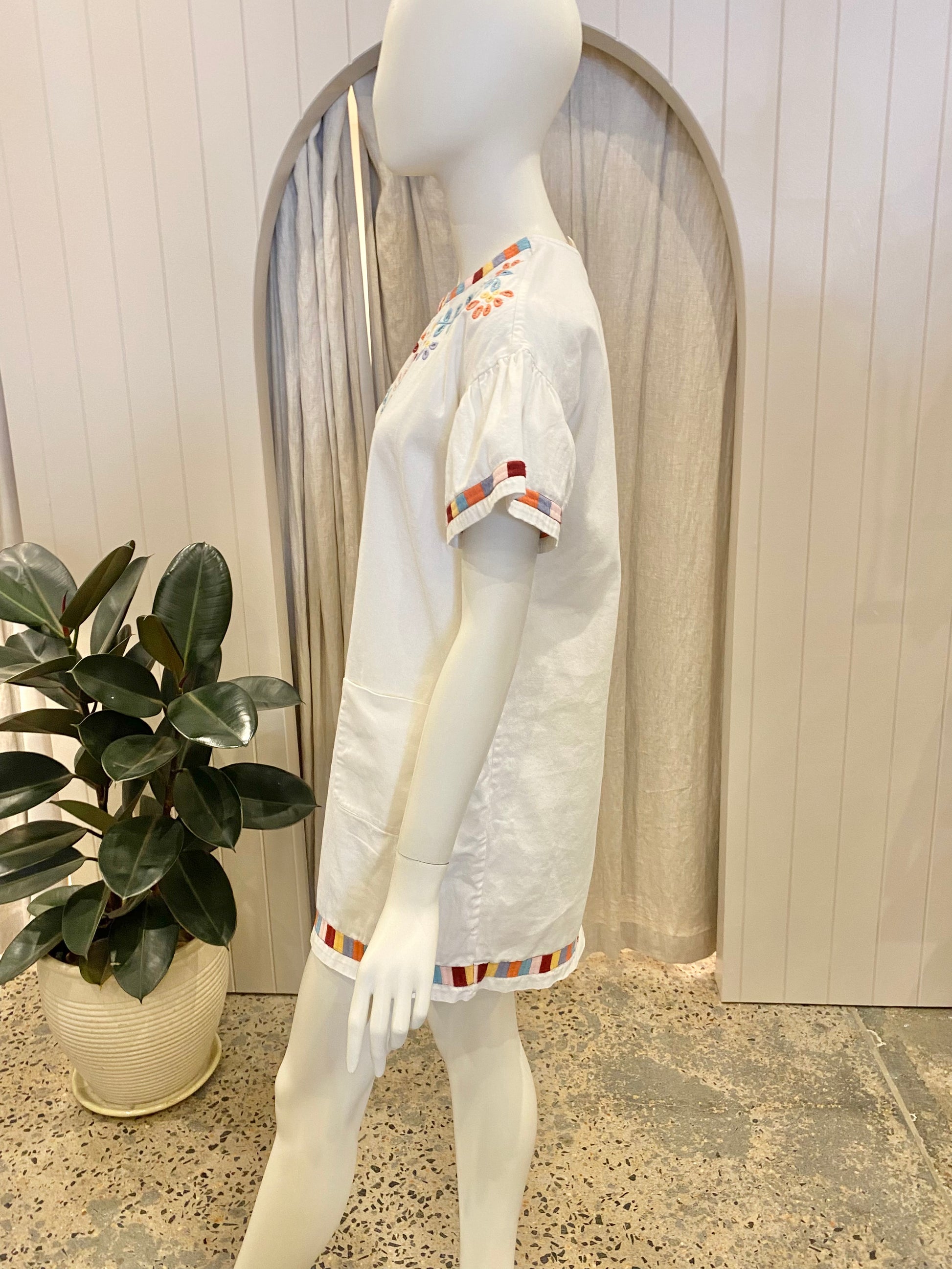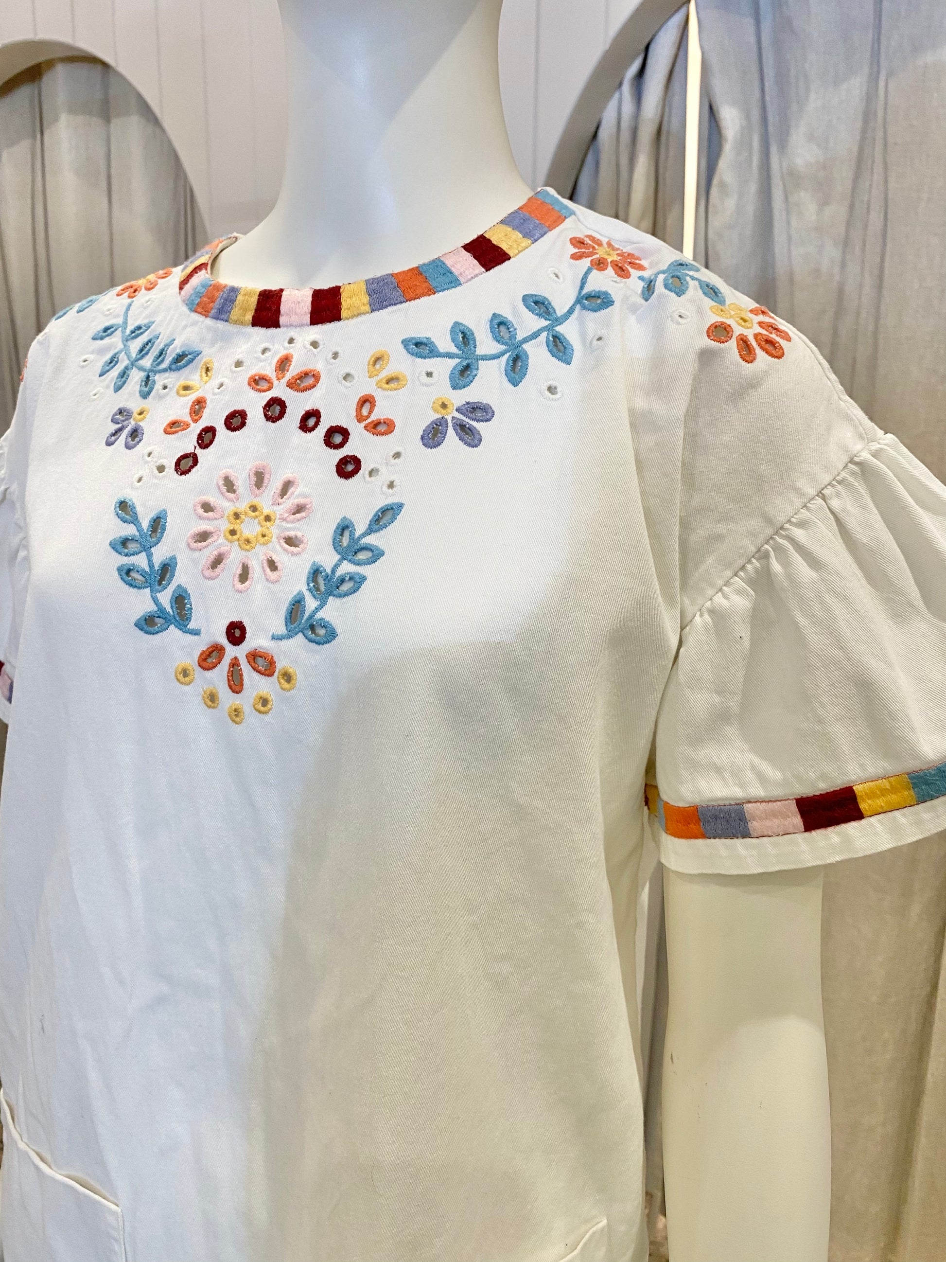 Description : - Short embroidered dress - Short gathered sleeves - Patch pockets on the front - Back slit closed with a button