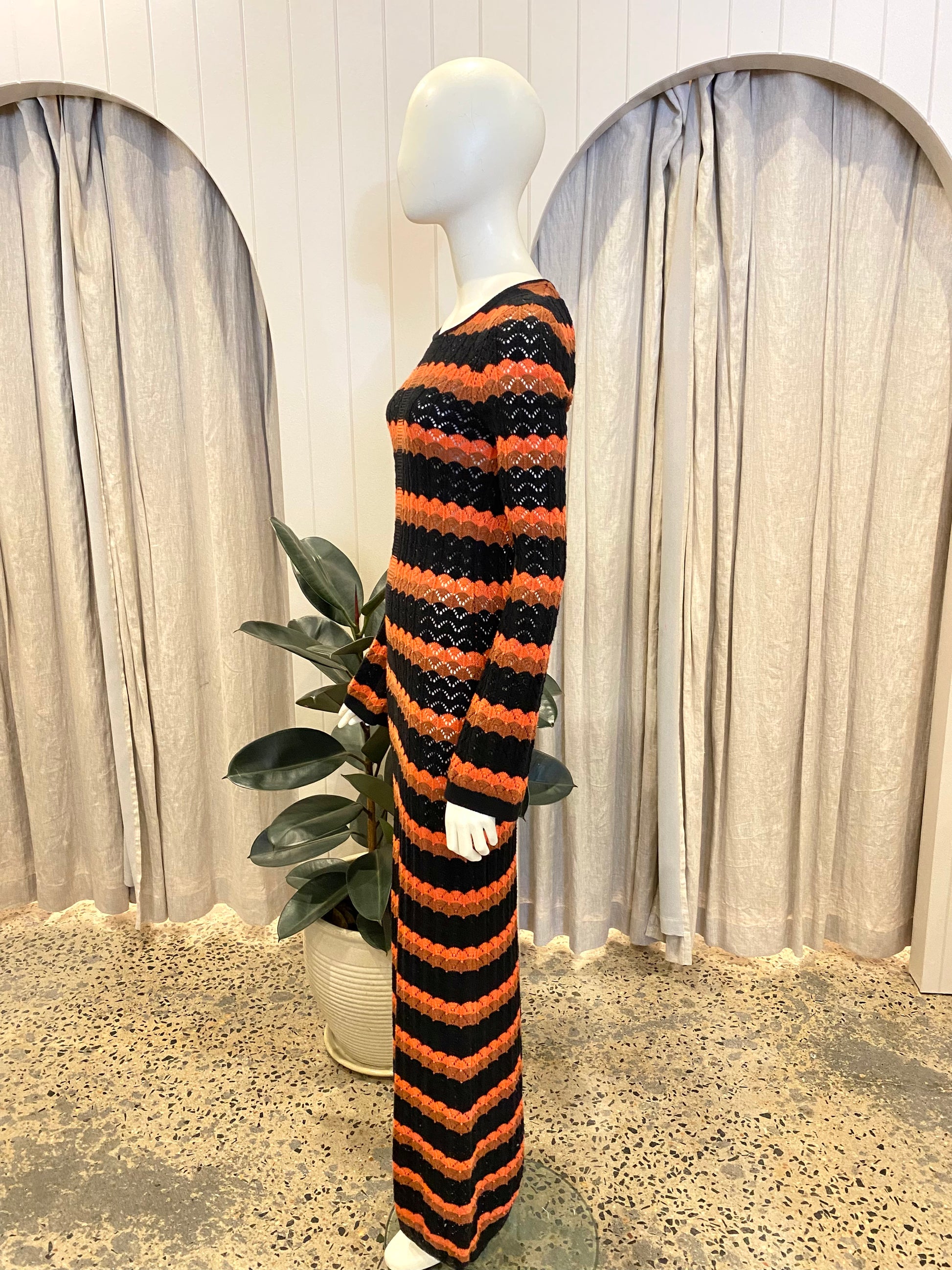 Description : Black and orange stripe crochet maxi dress with low scoop back and flared sleeves.