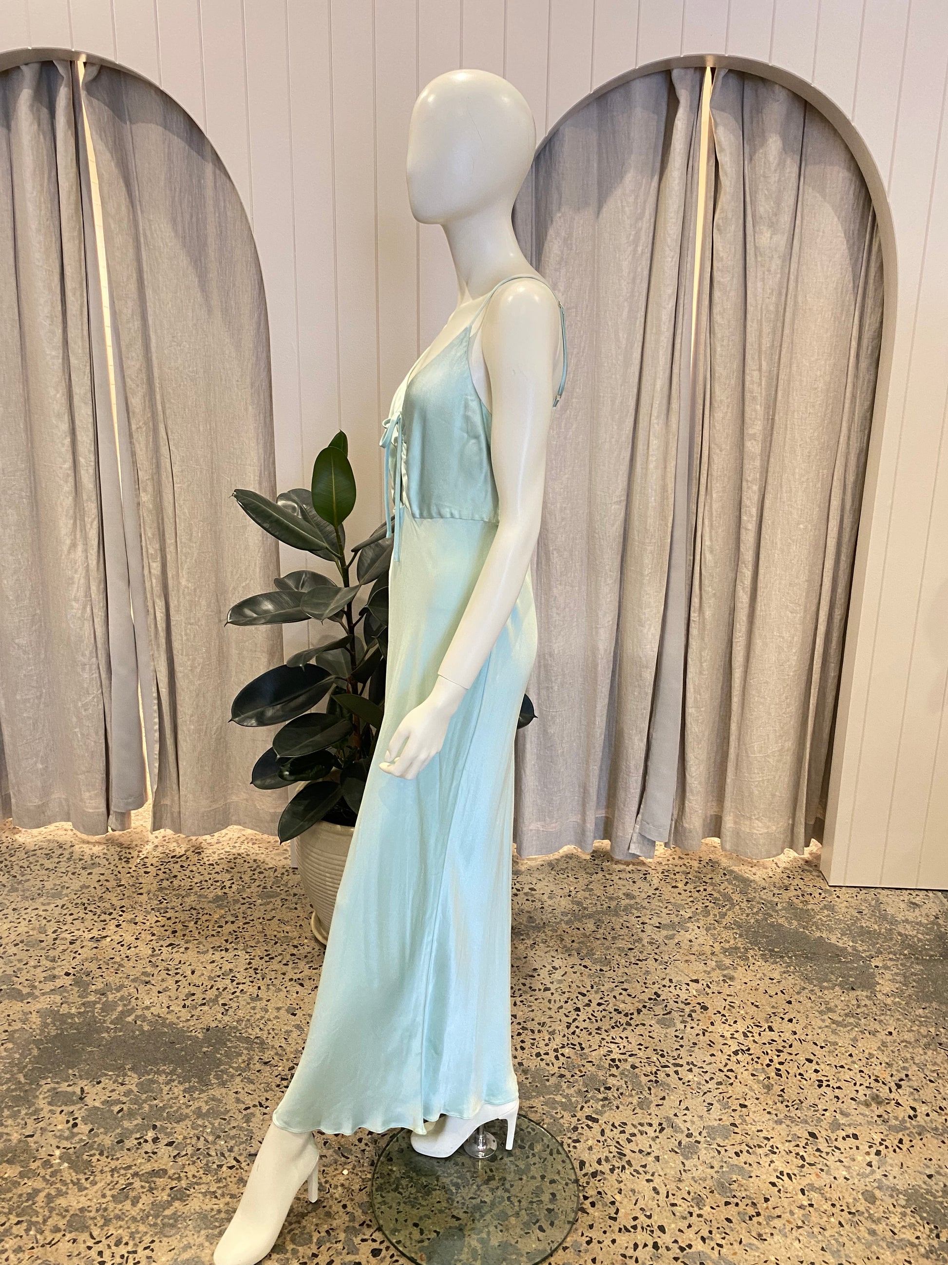 Description : Ruched detail with adjustable pull tie Cut on the Bias Adjustable straps Fitted bodice V neckline