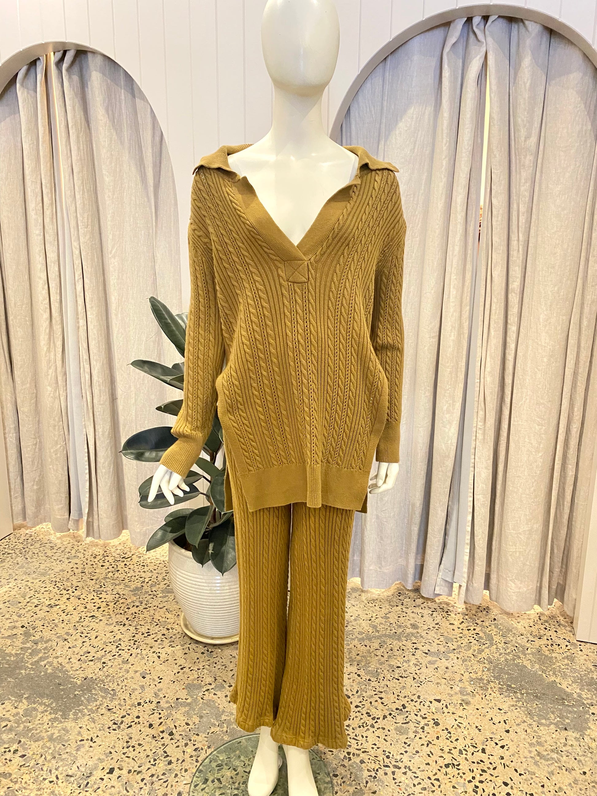 Description : - Sweater with V-neckline and collar, side splits, ribbed hem, neckline and cuffs, long sleeves - Knit pants with elastic waistband, wide leg