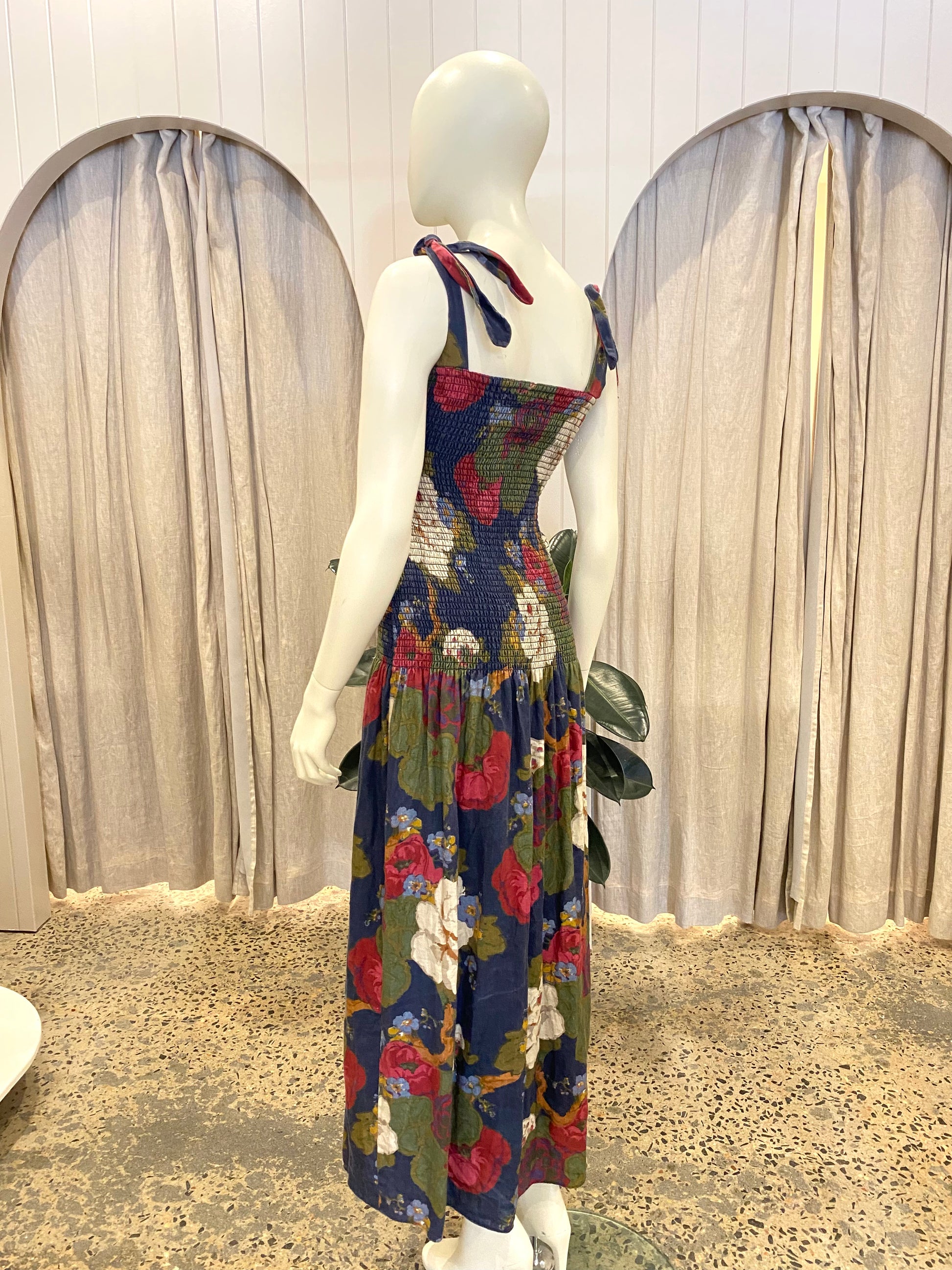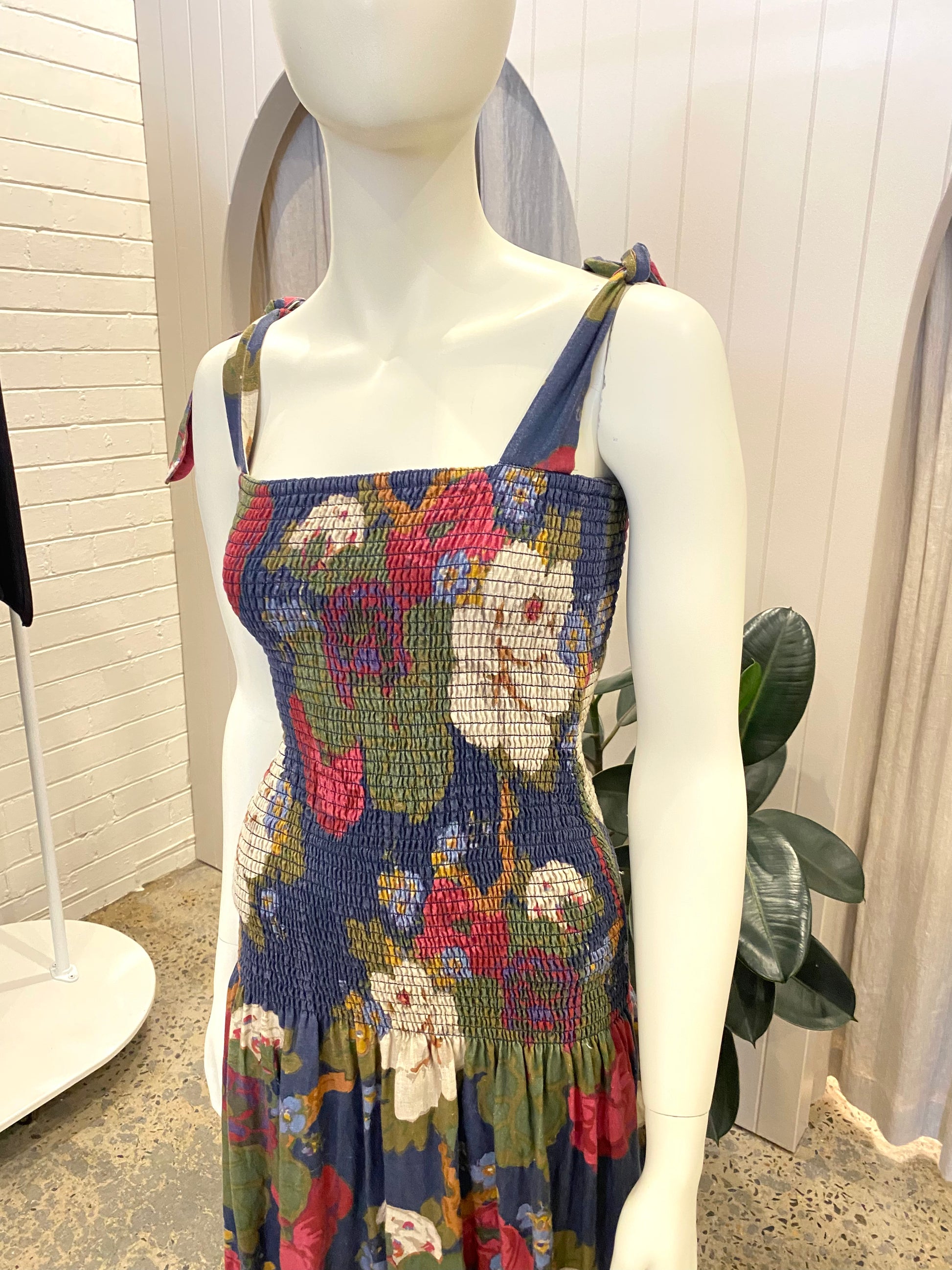 Description : shirred maxi dress ruched through the bodice dropped waist frilled tie straps for adjustability SIR. exclusive Garcia print
