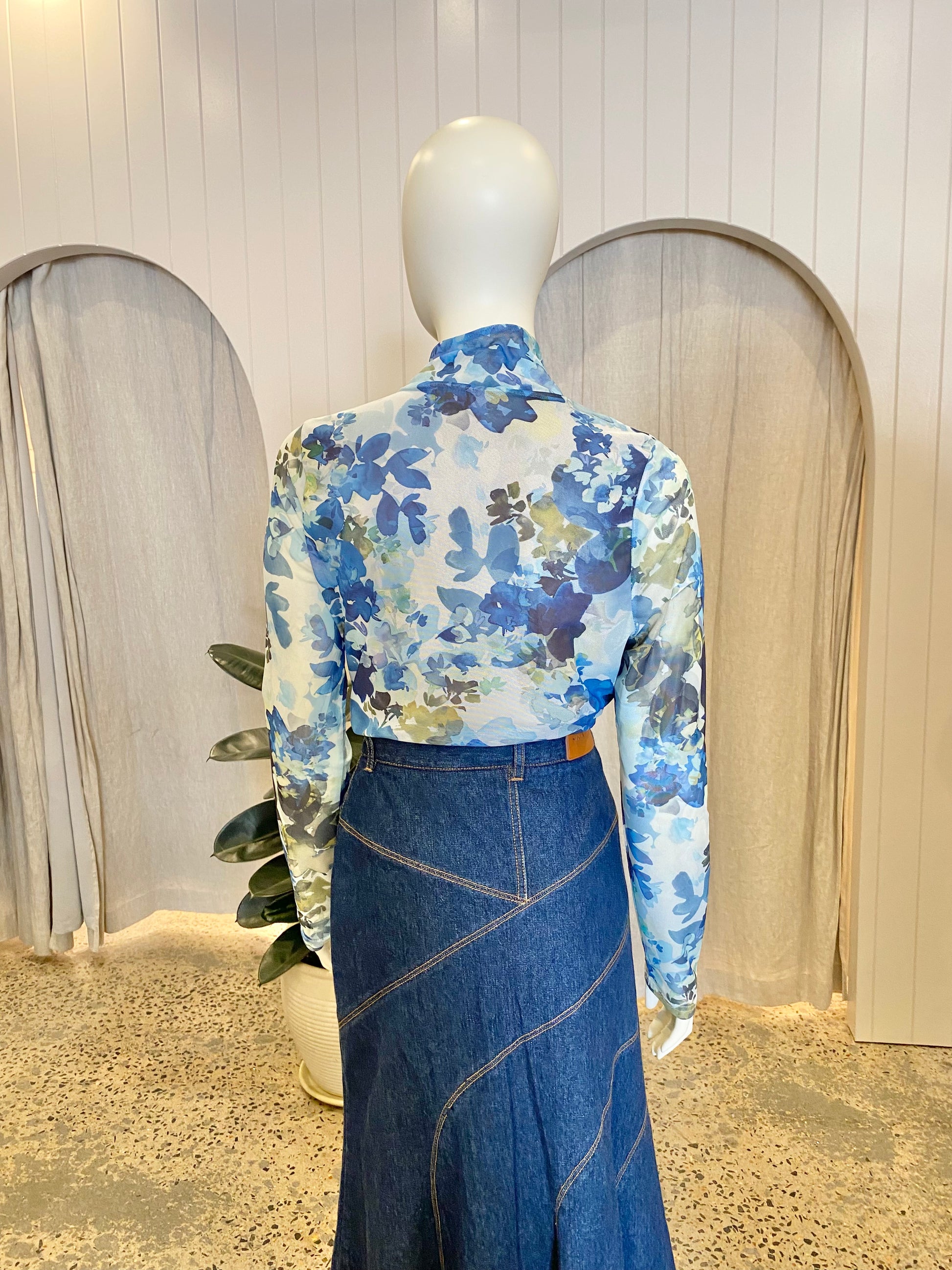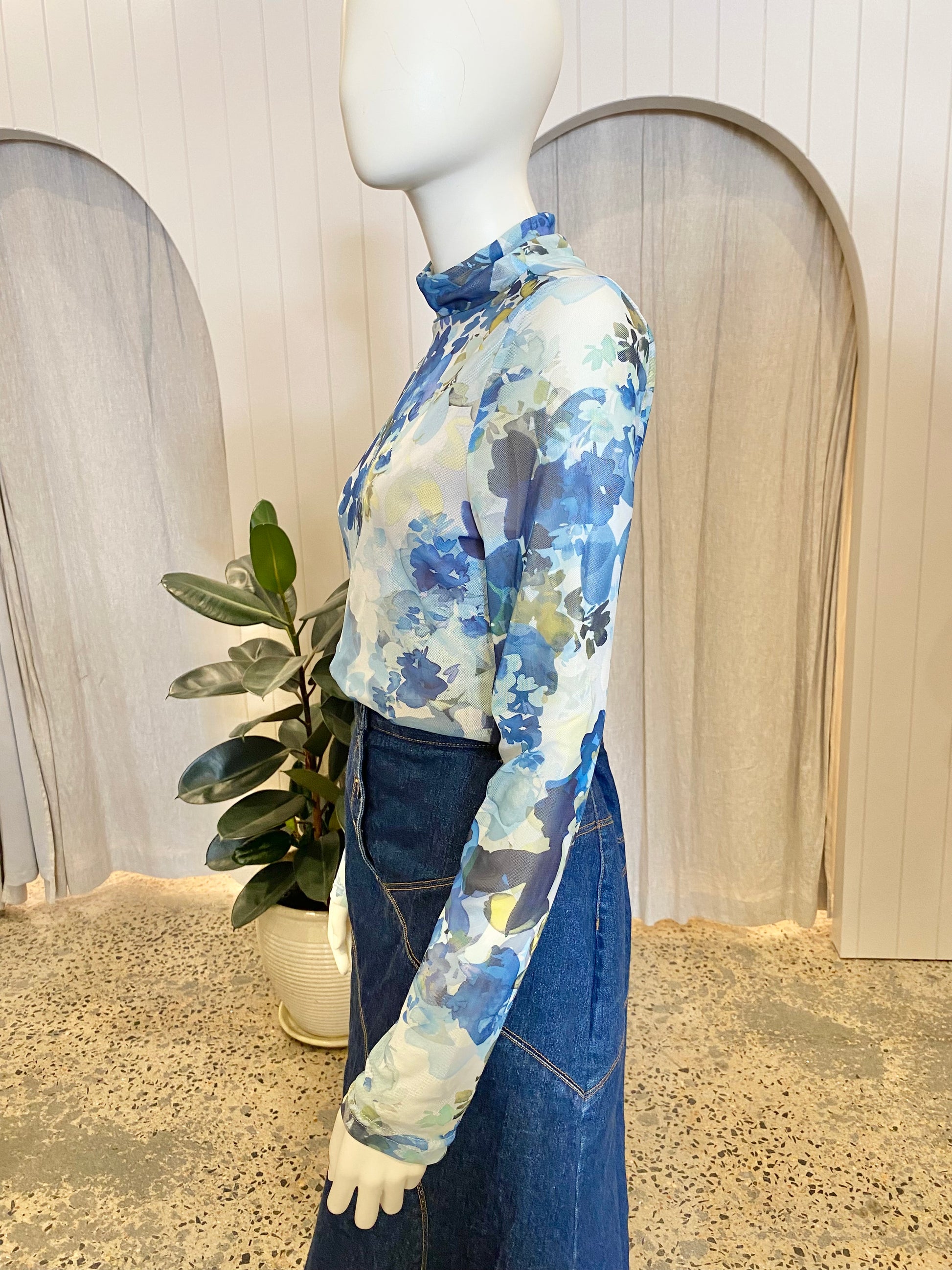 Description : - High neckline - Mesh fabrication - Floral print - Lined bodice - Sheer sleeves