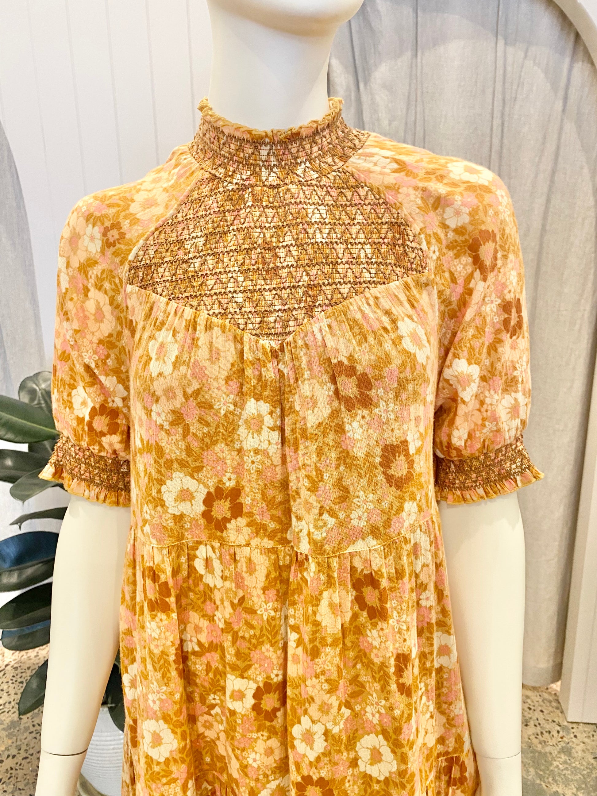 Description : Crafted from a bohemian floral print crinkle cotton fabric, this whimsical dress features a high smocked neckline, short puff sleeves and falls to a full skirt with lace trim.