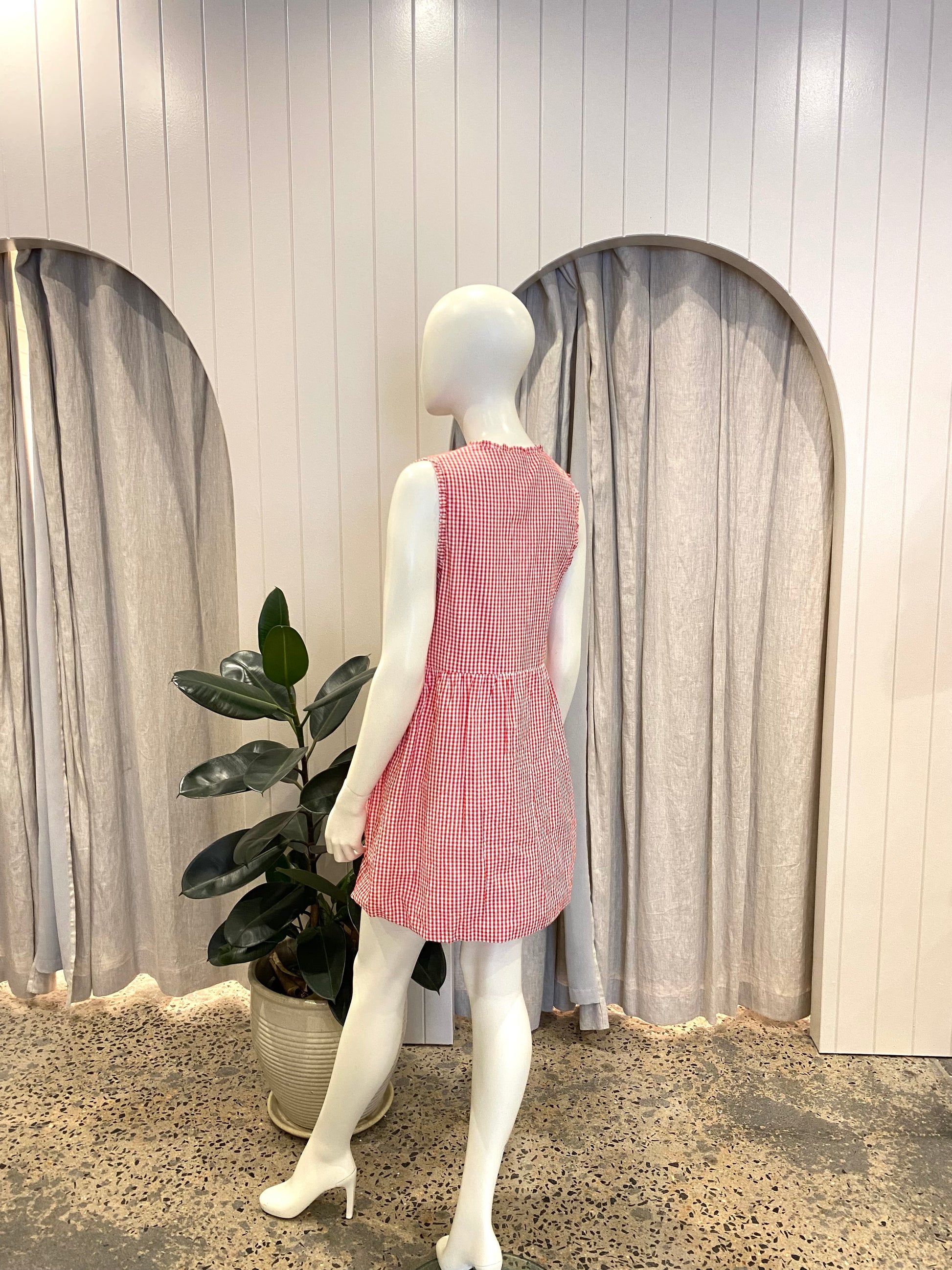 Description : This red and white gingham mini dress from Australian label Steele is a signature mini-length shift dress with a relaxed silhouette and distinctive bubble hem. With a deep V-neckline framed with delicate frill trim and is crafted from lightweight 100% cotton.