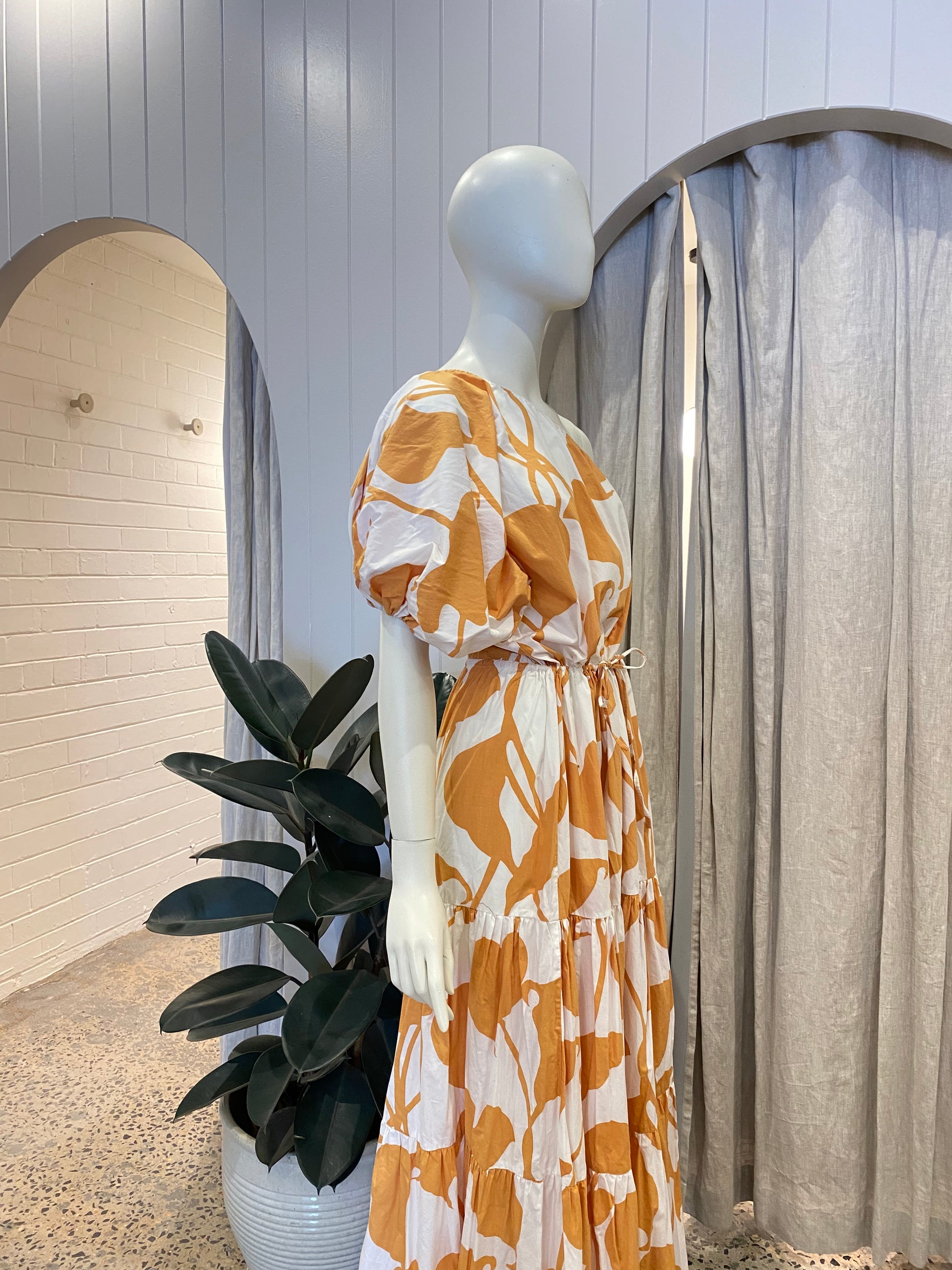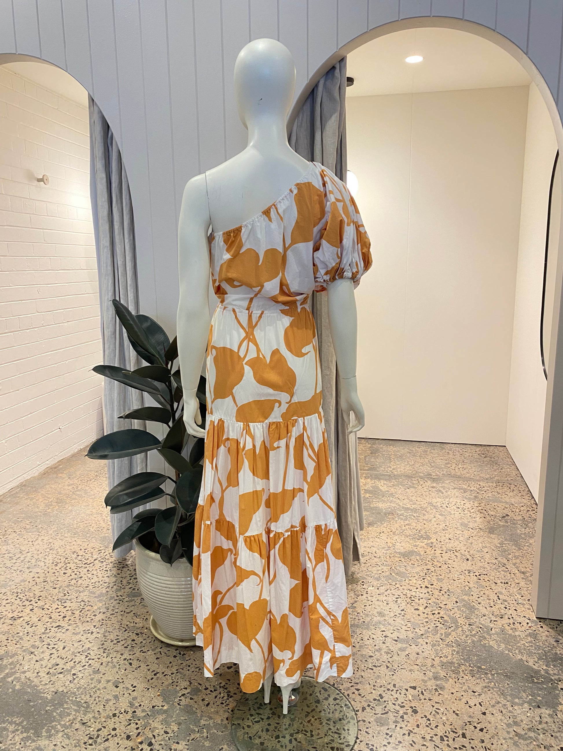 Description : orange floral midi dress, one shoulder short sleeve, elastic neckline, waist tie, tiered skirt detailing