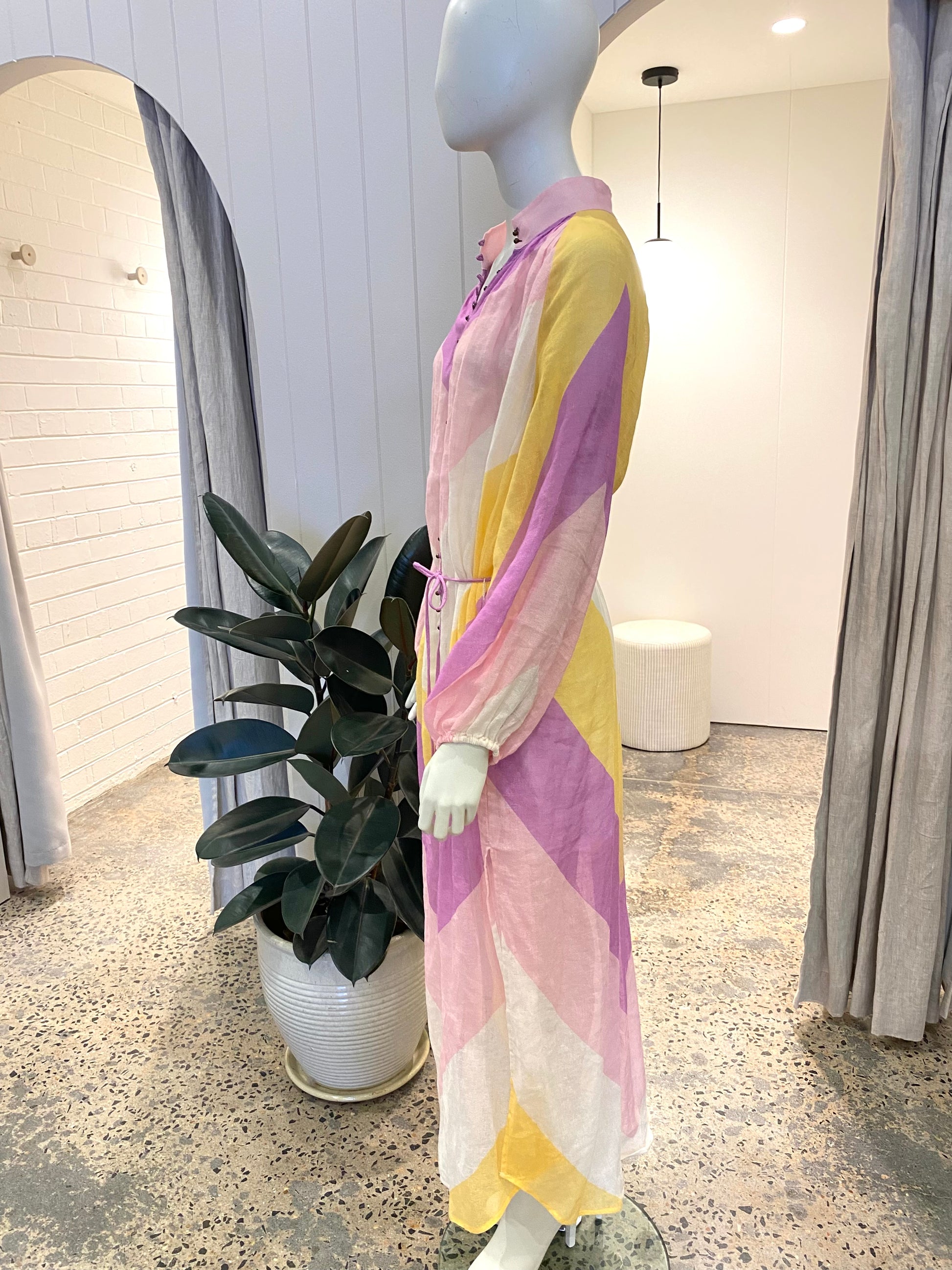Description : - Versatile style, wear as dress or open as a duster jacket - Relaxed fit - Raglan blouson sleeves with elastic cuff - Antique brass button through front - Rouleau belt - Curved shirt hem with split - Maxi length - Mid sheer - No slip