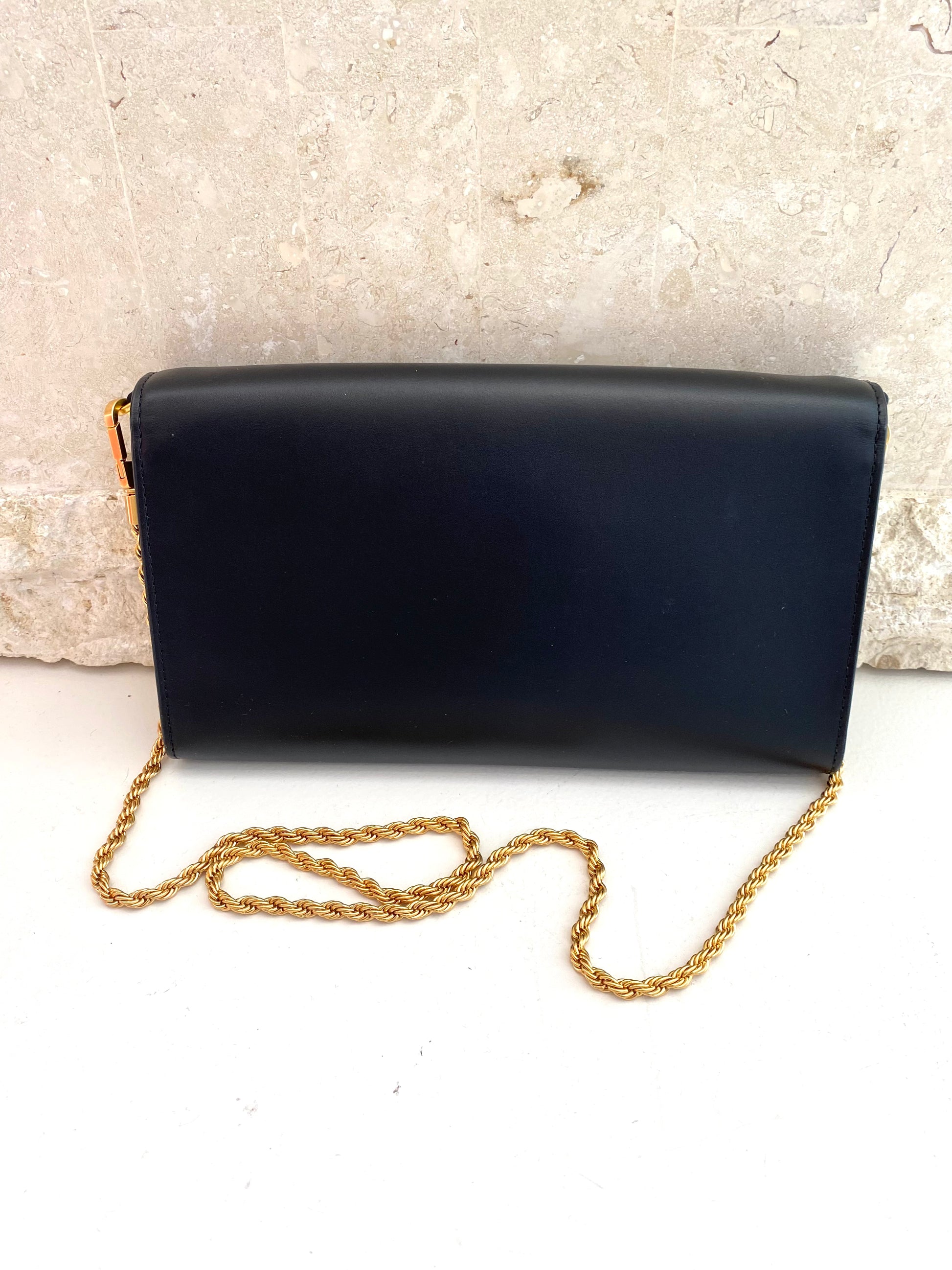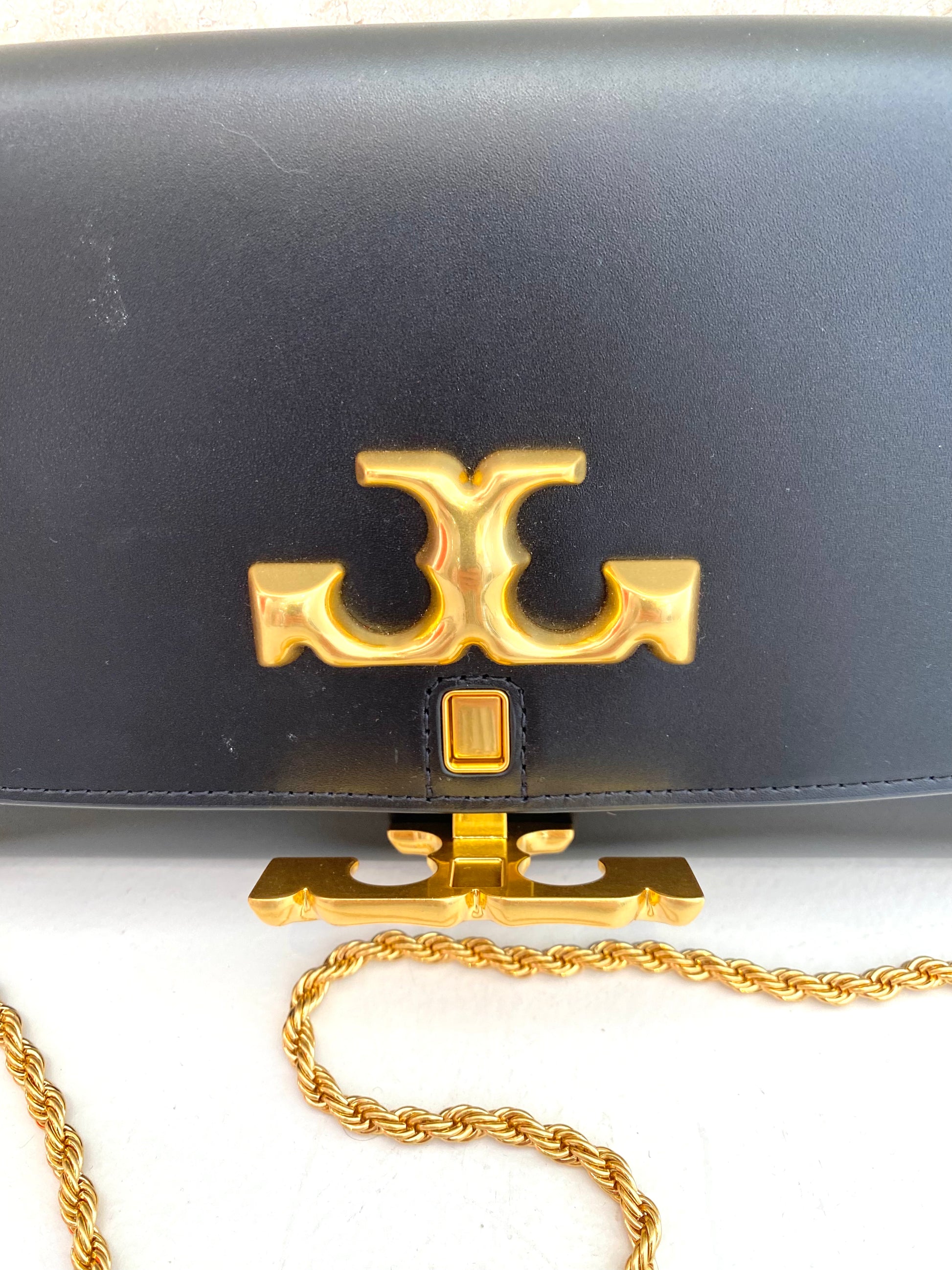 Description : Signature hardware, scaled-up in sculptural brass. The Eleanor Clutch is a strong, structured shape in smooth Italian leather with edges that are painted by hand, to emphasise the impeccably clean lines. It comes with a removable twisted rope chain. * Fits all phone sizes up to an iPhone 11 Pro and Samsung Galaxy Note 10+ * Italian leather * Bonded interior * Magnetic snap closure * Removable chain strap with 17.7"; (44.5 cm) drop * 1 interior zipper pocket * Height: 5.7"; (25 cm); length: 10"; (25 cm); depth: 1"; (2.5 cm)
