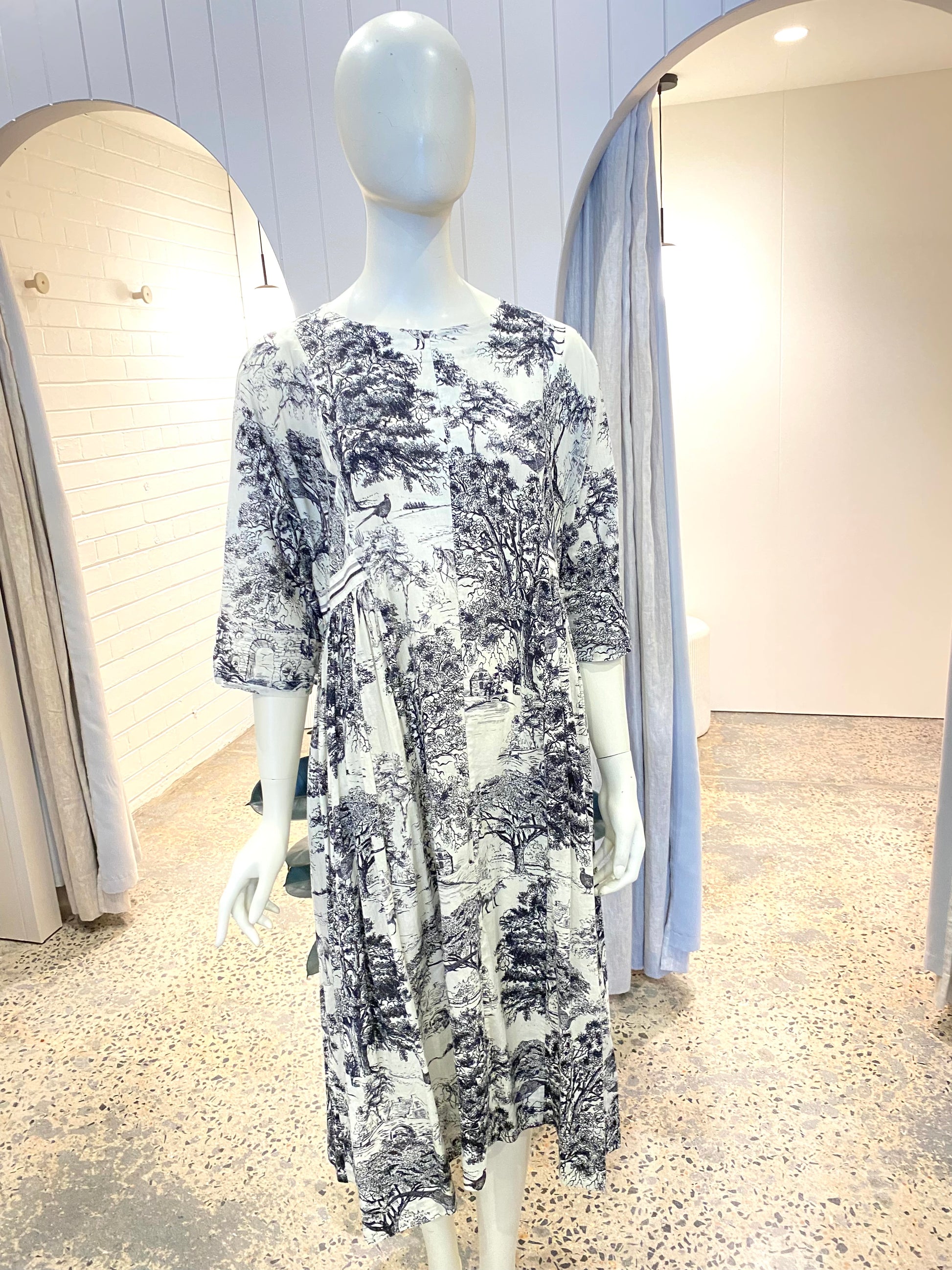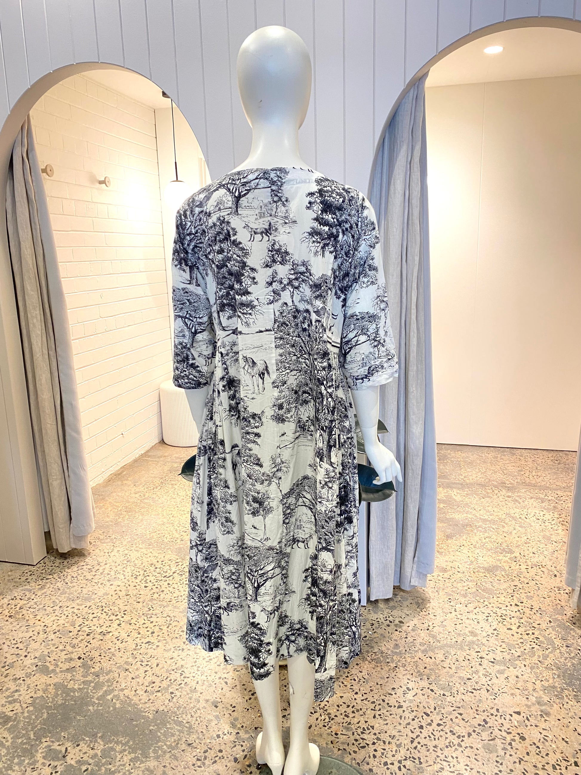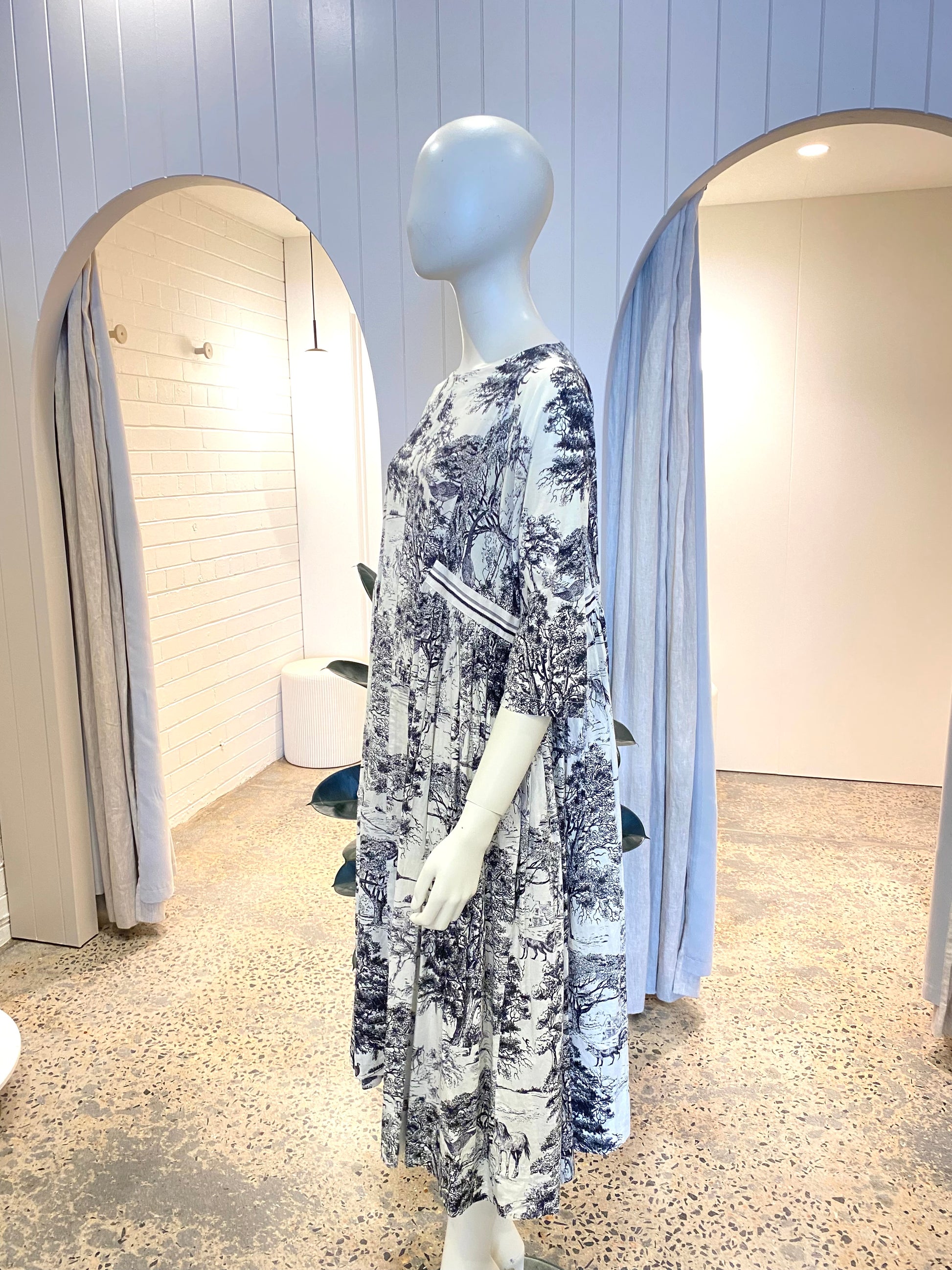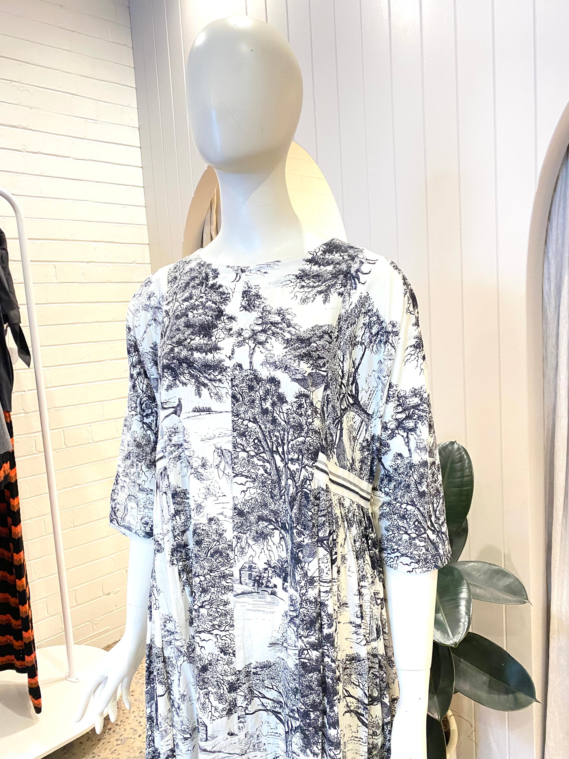 Description : Navy and white floral print, round neckline, short sleeves, pleating on sides, oversized relaxed fit