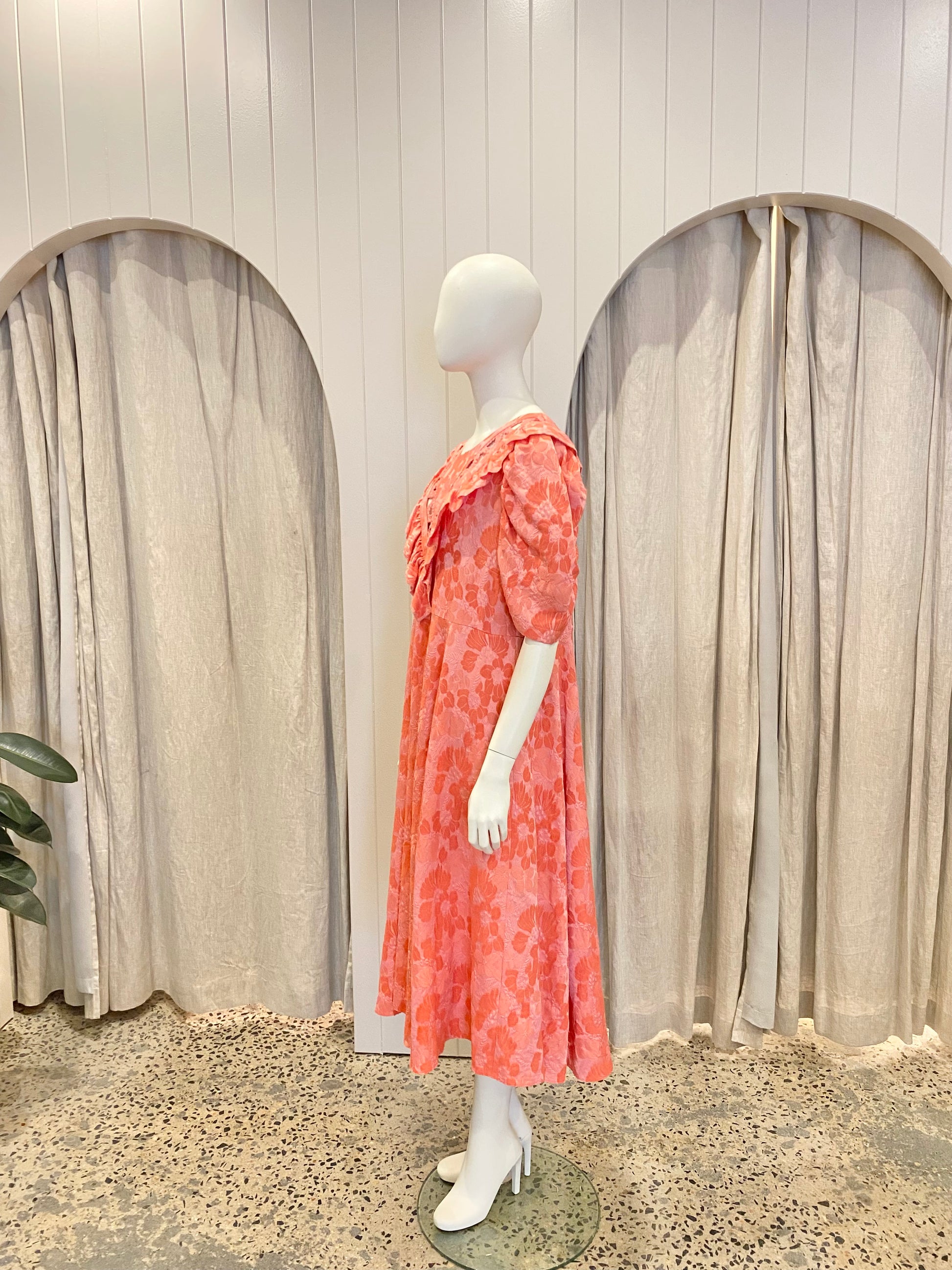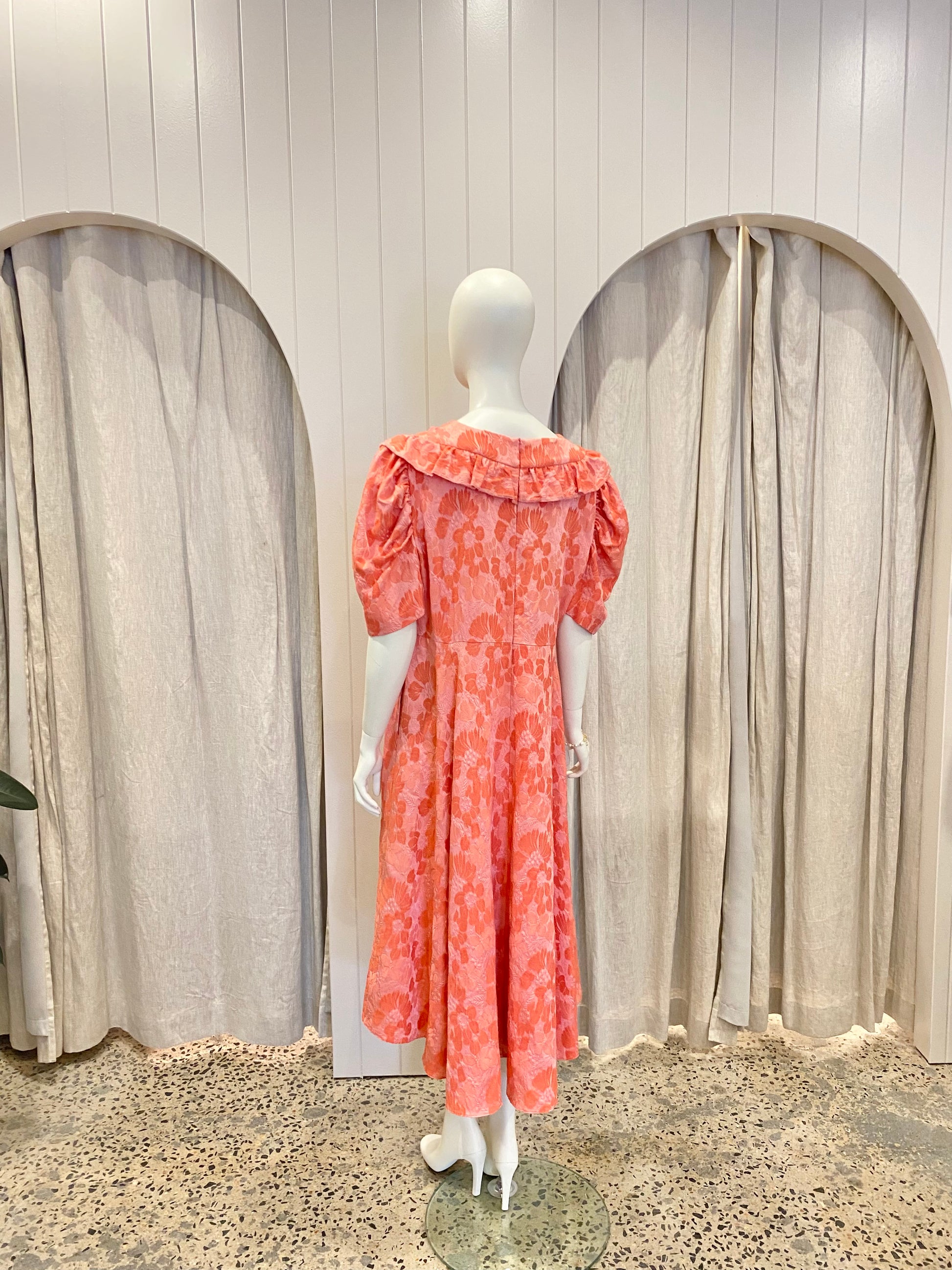 Description : The V To My Heart Dress is a signature piece from the Trelise Cooper Spring 2022 collection, known for its romantic and feminine aesthetic. Designed in the "Baroque The Rules" Wool/Viscose blend. Design Features: A statement frilled V-neckline featuring delicate lace insert detailing. Voluminous short puff sleeves that add a modern, playful silhouette. A flattering A-line midi-length skirt that offers easy movement.