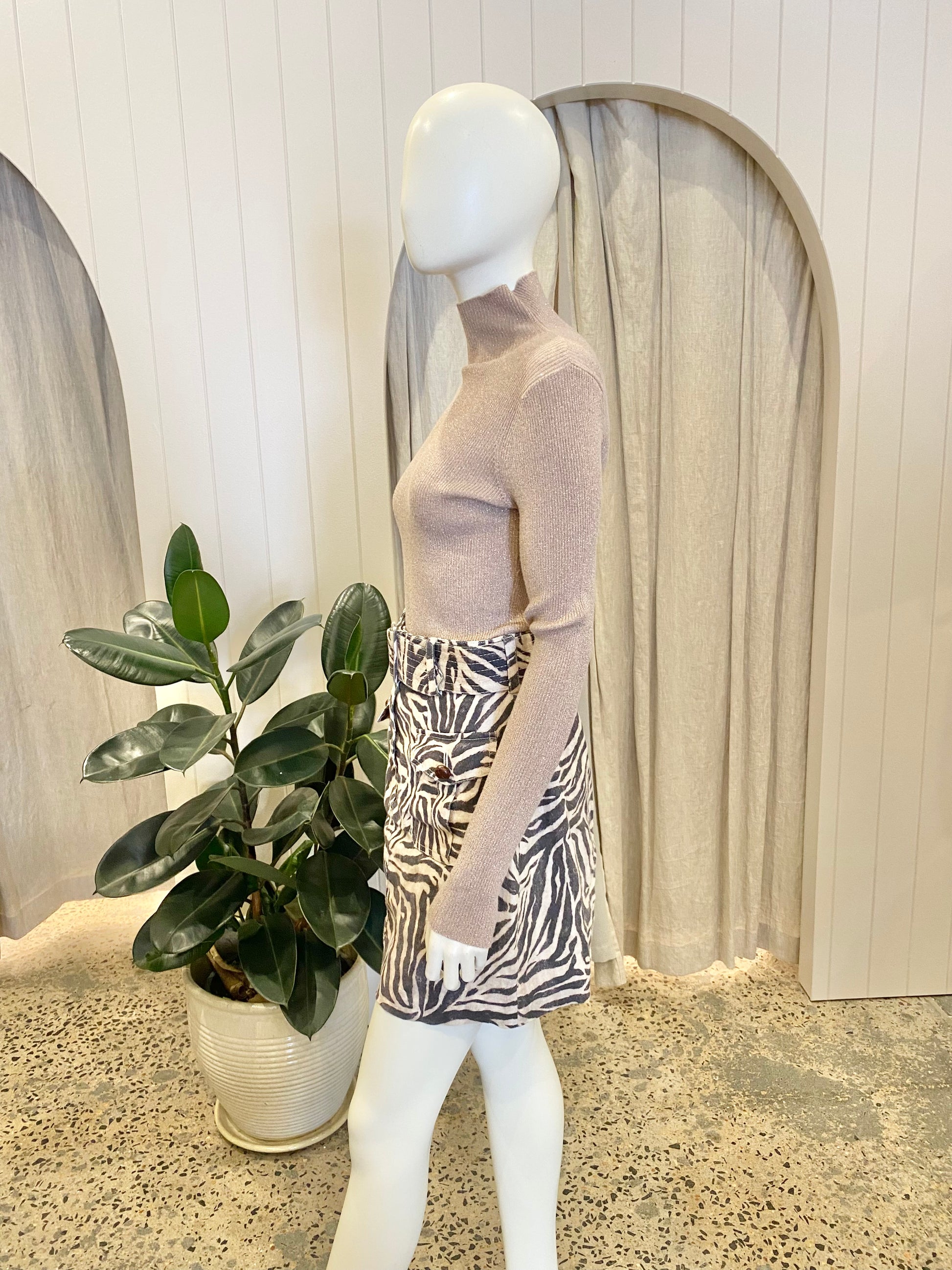 Description : Linen mini skirt featuring a belted waistband, functional pockets, front zipper and zebra print.