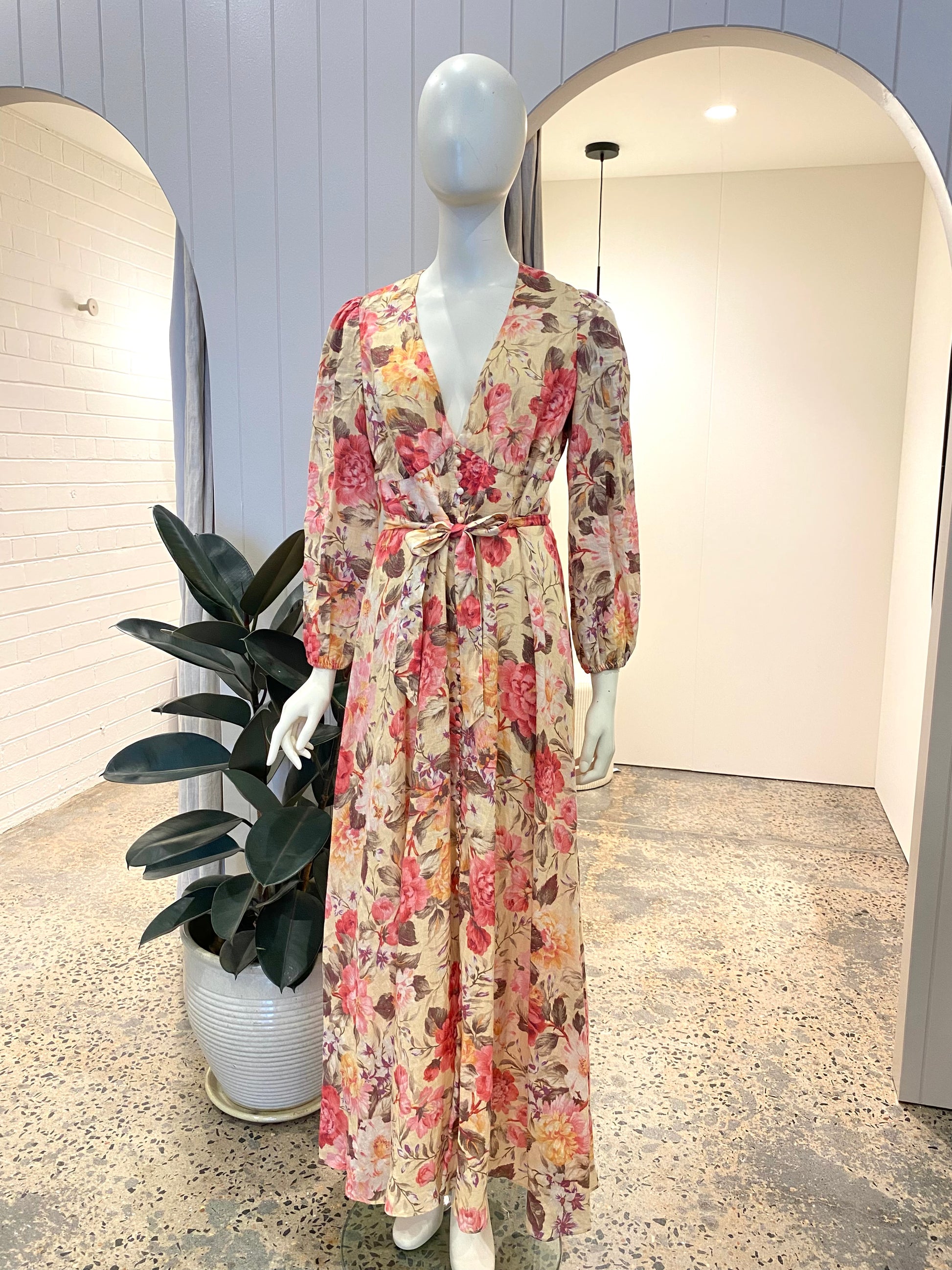 Description : - Empire waist - Maxi length - Plunging V neckline - Button front - Long sleeve with elastic cuff - Rear zip closure - Matching fabric belt can be worn on the neck or waist