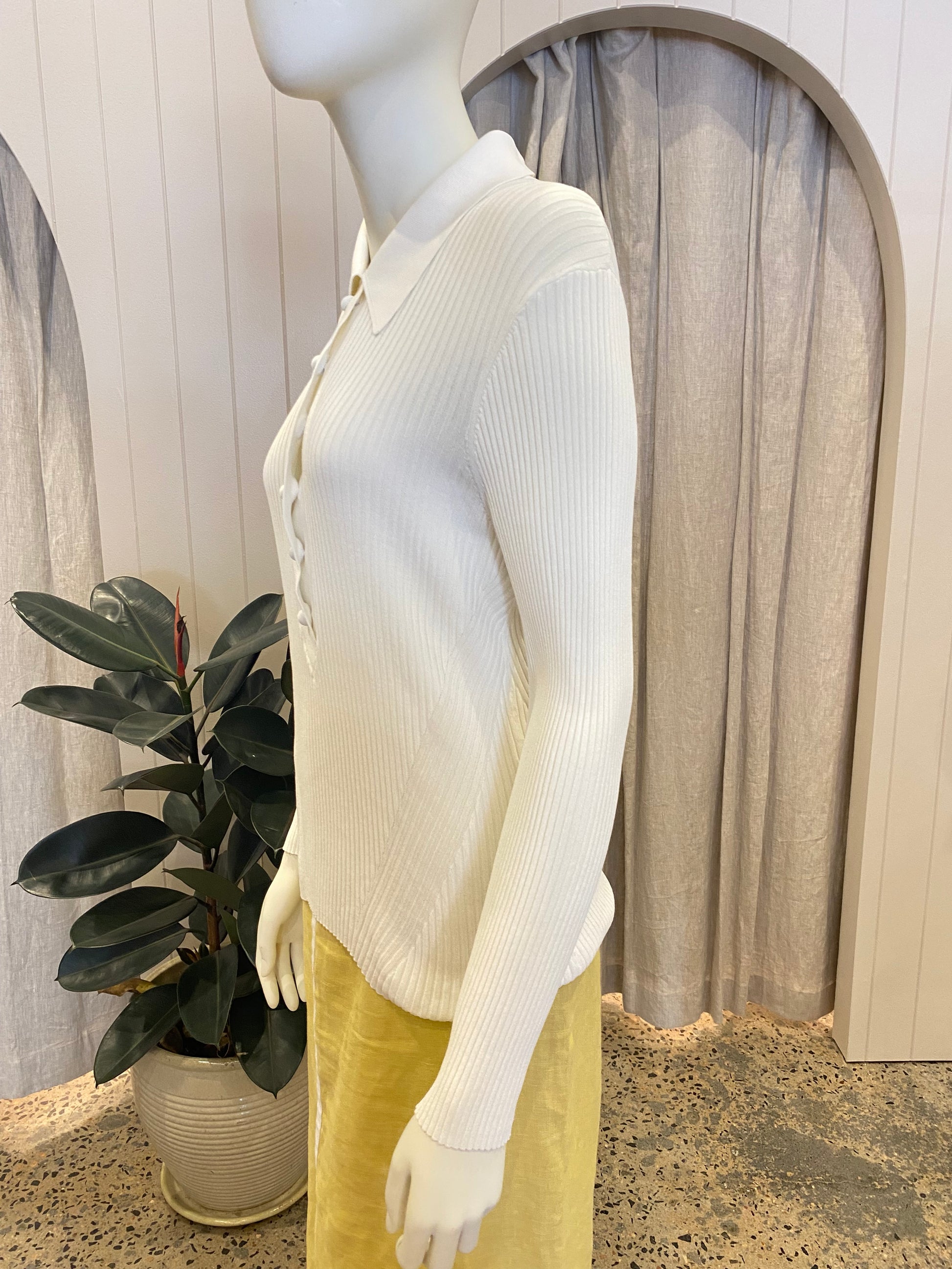 Description : white ribbed long sleeve, chest button down, pointed collar, fitted silhouette