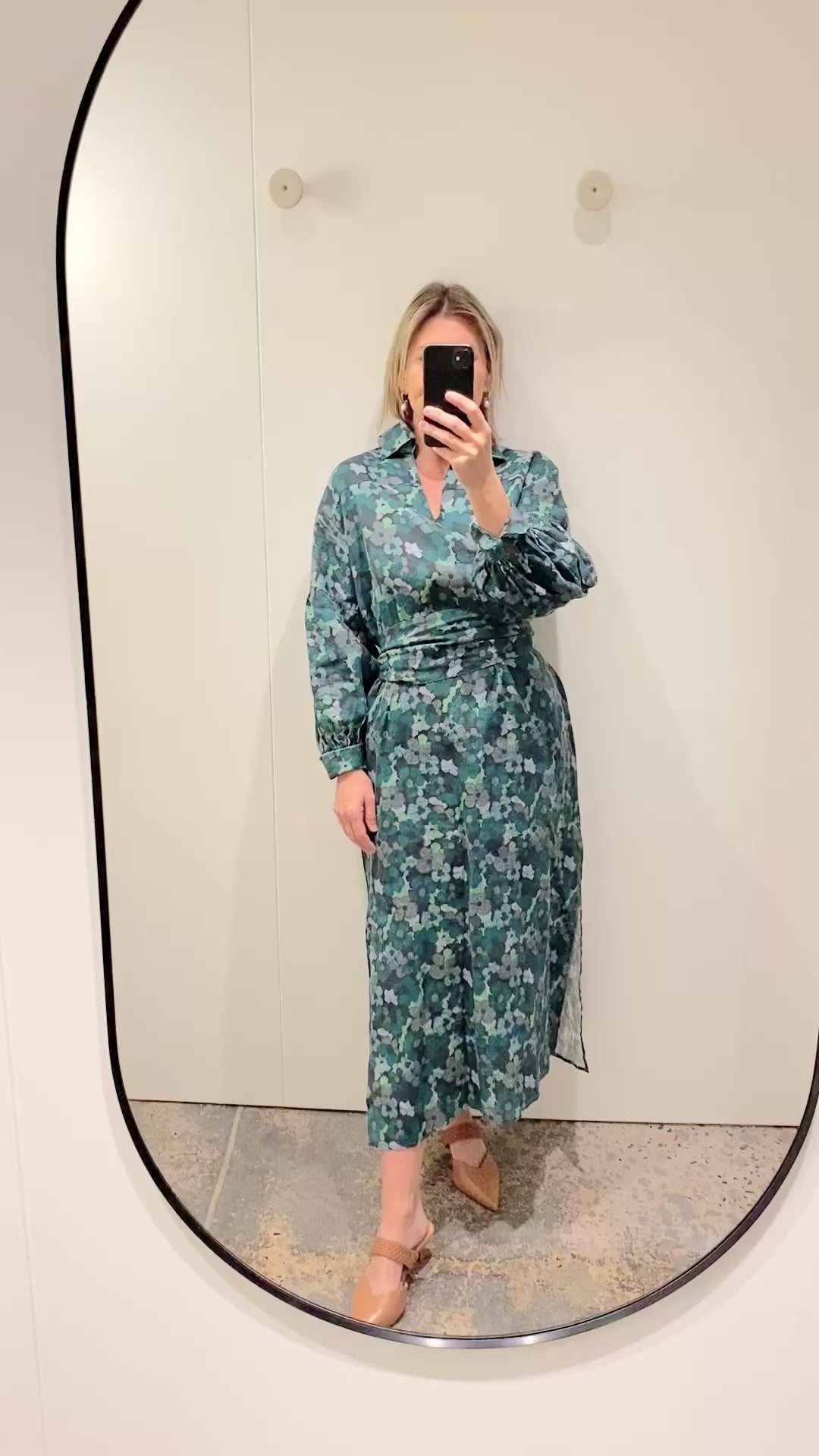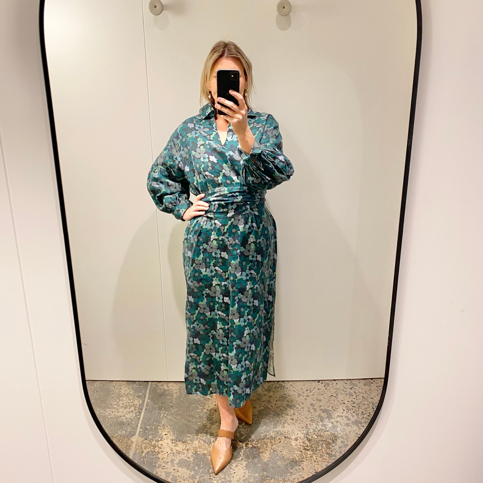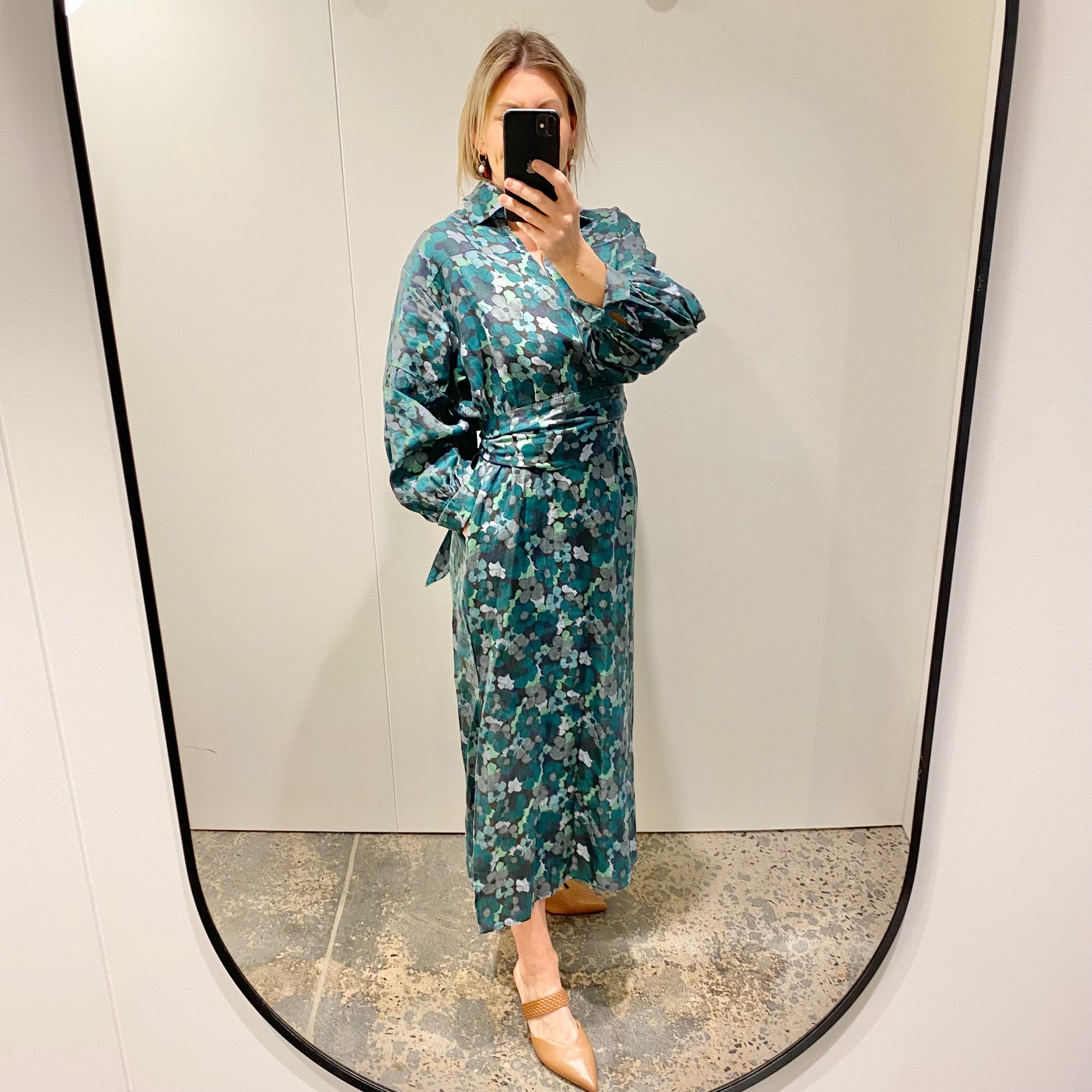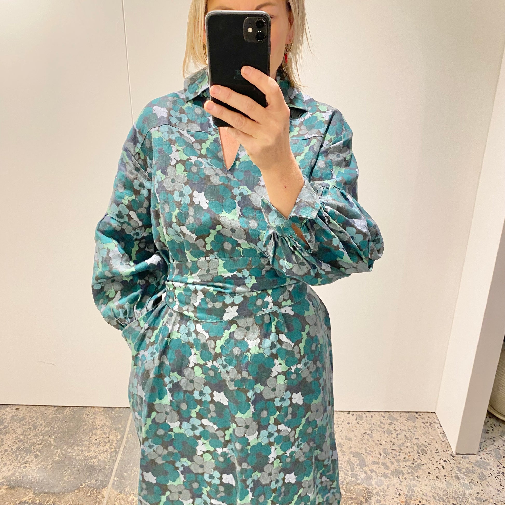 Description : - 100% linen for quality and comfort - deep, nature-inspired floral palette - Collared - V neck - Billowy sleeves with button cuff - Self-tie belt included