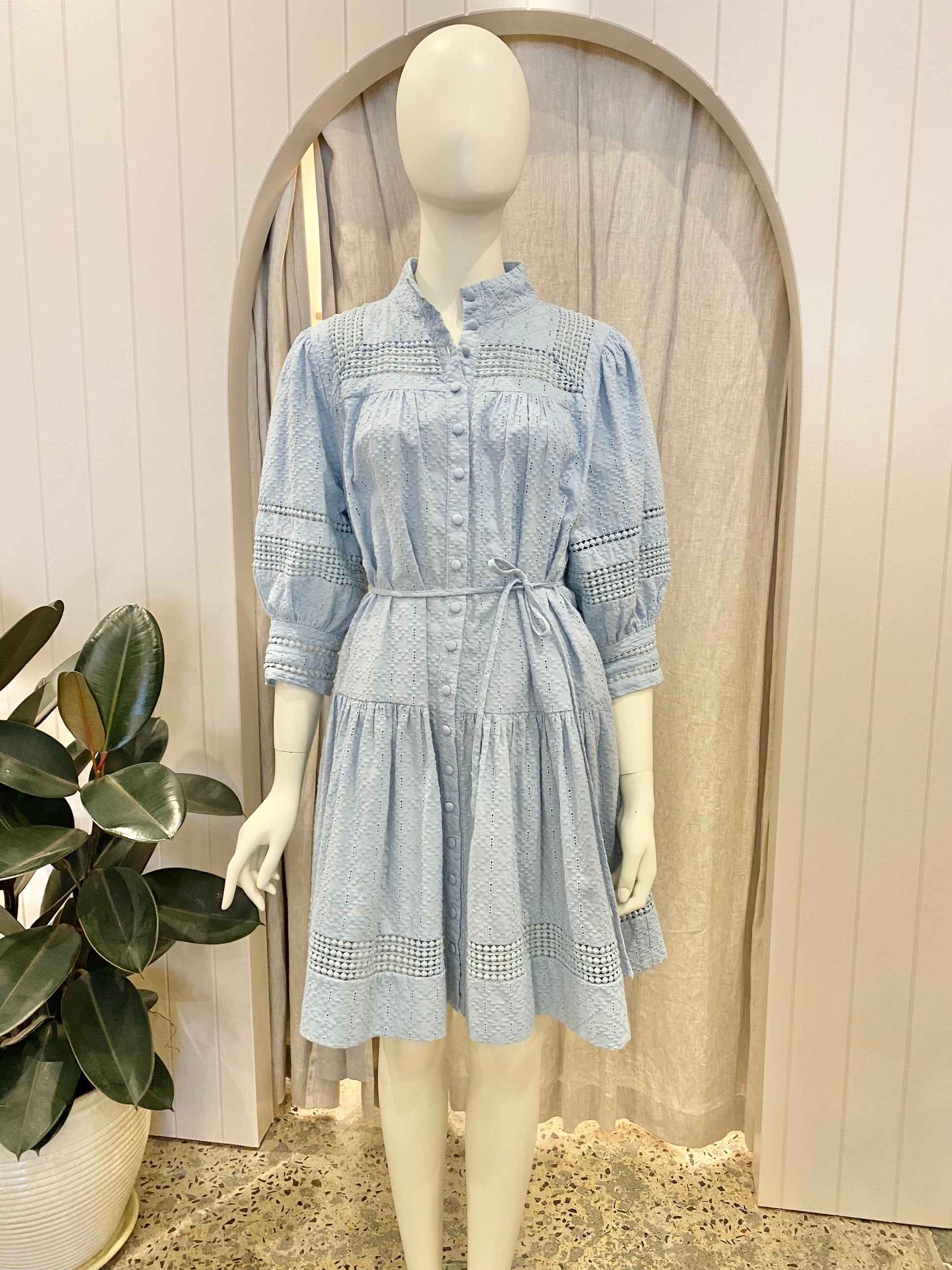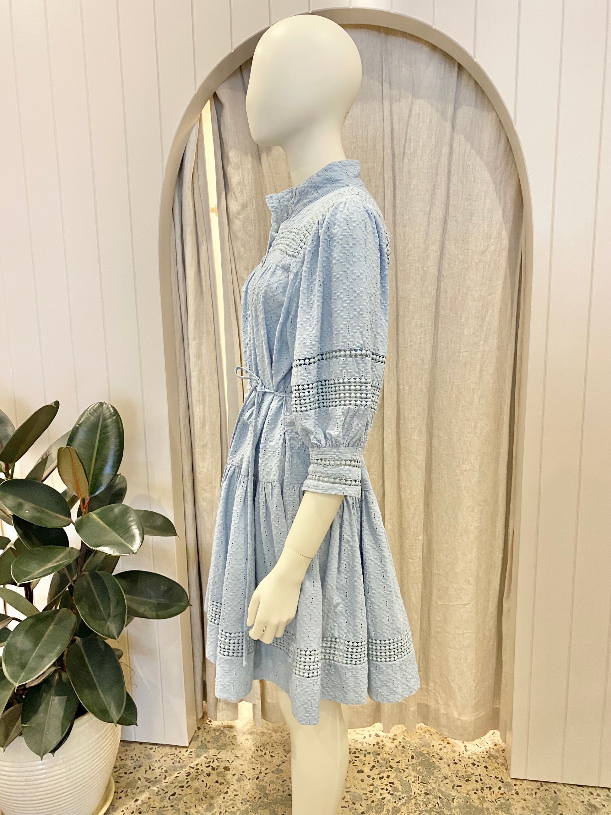 Description : light blue midi dress, 3/4 blouson sleeves, ladder lace detailing, front button-down closure, high neckline, small waist string